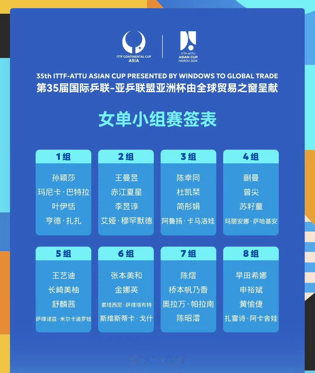 海口亚洲杯第一阶段女单小组赛签位新鲜出炉! 第35届海口亚洲杯女单第一阶段分组如图所示。 比赛分两个阶段进行。 第一阶段将所有32名选手分成八组(同协会选手避让),进行循环赛,小组排名前两位的晋级第二阶段比赛。 第二阶段为淘汰赛,第一轮16名选手进行1/8决赛,五局三胜制,之后的轮次实行七局四胜制。 国乒选手都是种子选手,估计都能保证小组出线。 国际乒联记得合理安排赛程保护运动员,不能让选手们再出现因为赛程密集而受伤退赛的情况。