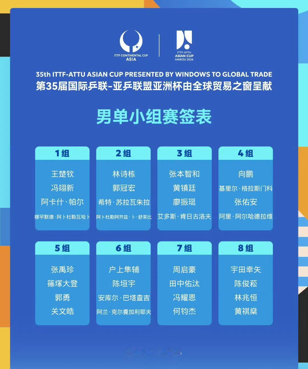 亚洲杯第一阶段小组赛签位发布! 第35届海口亚洲杯男单第一阶段分组如图所示。 林