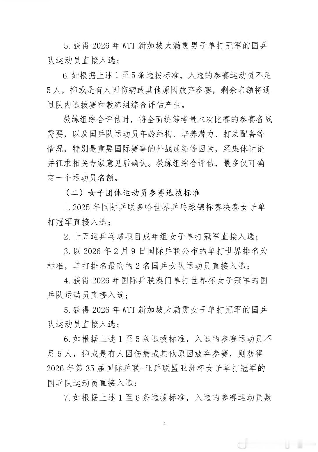 4.获得2026年国际乒联澳门单打世界杯女子冠军的国乒队运动员直接入选;