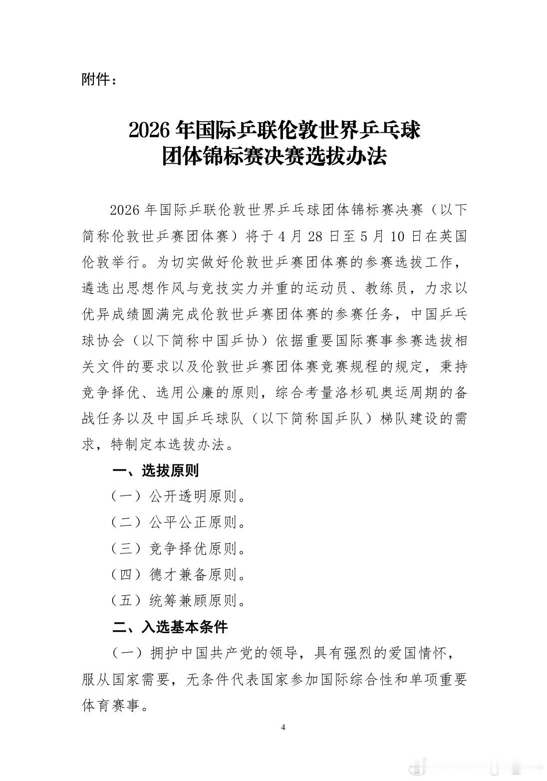4.获得2026年国际乒联澳门单打世界杯男子冠军的国乒队运动员直接入选;