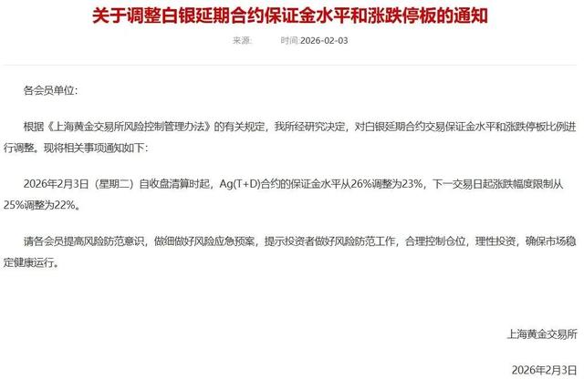 2026年2月3日(星期二)自收盘清算时起,Ag(T+D)合约的保证金水平从26%调整为23%,下一交易日起涨跌幅度限制从25%调整为22%。