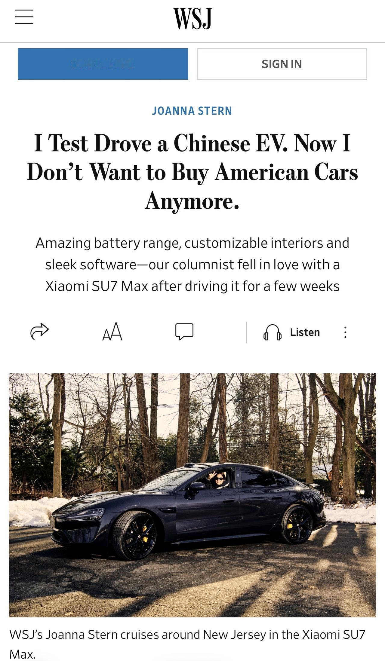 “我再也不想买美国车了” 在驾驶了中国制造的小米SU7电动汽车在美国道路上行驶后, 美国著名科技专栏作家乔安娜.斯特恩JoannaStern提出了一个灵魂拷问:“为什么美国汽车制造商如此落后?这些先进的汽车何时才能进入美国市场? ”