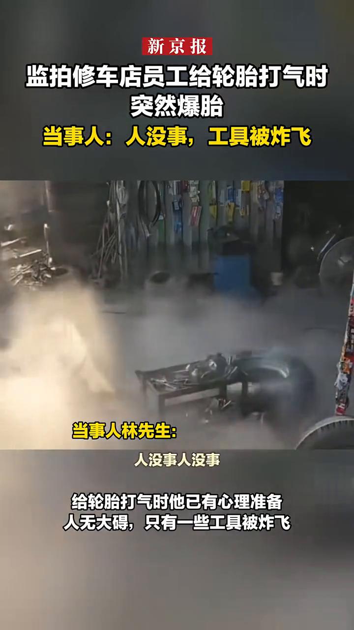 监拍修车店员工给轮胎打气时突然爆胎。当事人:人没事,工具被炸飞。 新京报。 2月2日,监控拍下深圳一修车店员工给轮胎打气时突然爆胎。当事人林先生:我们当时补胎之前就已经知道这个轮胎不好,(车主说)尽量补胎,结果补了打气就炸了。当时打气的时候已经有注意过那个风险,给轮胎打气时他已有心理准备。人无大碍,只有一些工具被炸飞。