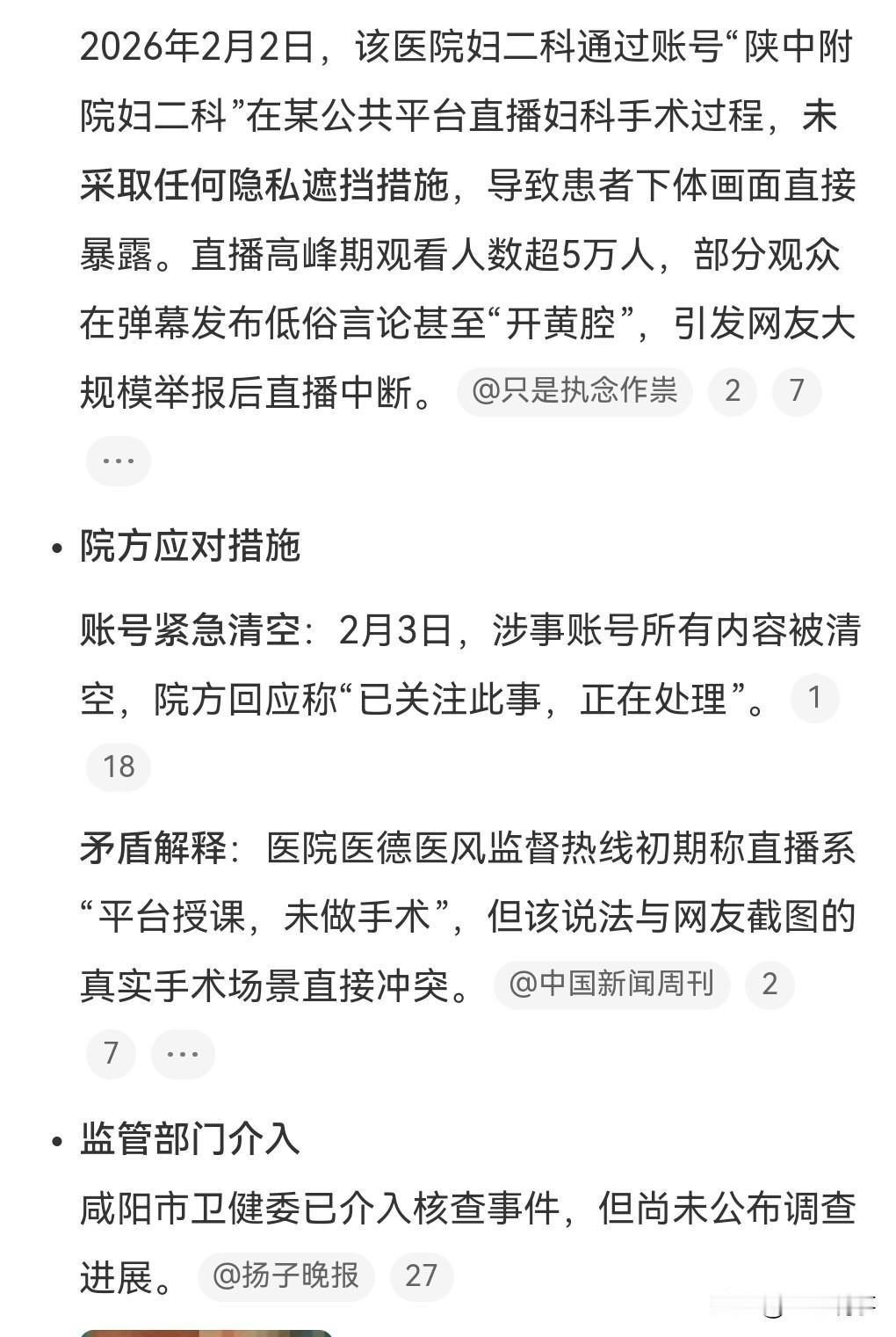 实在是太恶劣了。2月2日,有医院在直播的时候竟然泄露了女患者的隐私部位。 这真是造成了很大的不良影响。有很多网友都看到了,有的甚至在弹幕开黄腔。 2月3日报道,涉事医院直播账号已清空。 出了问题就想一删了之,有这么便宜的事吗?必须追责。 这为了流量竟然直播手术,并且还暴露女患者的隐私,这可不是小问题啊。