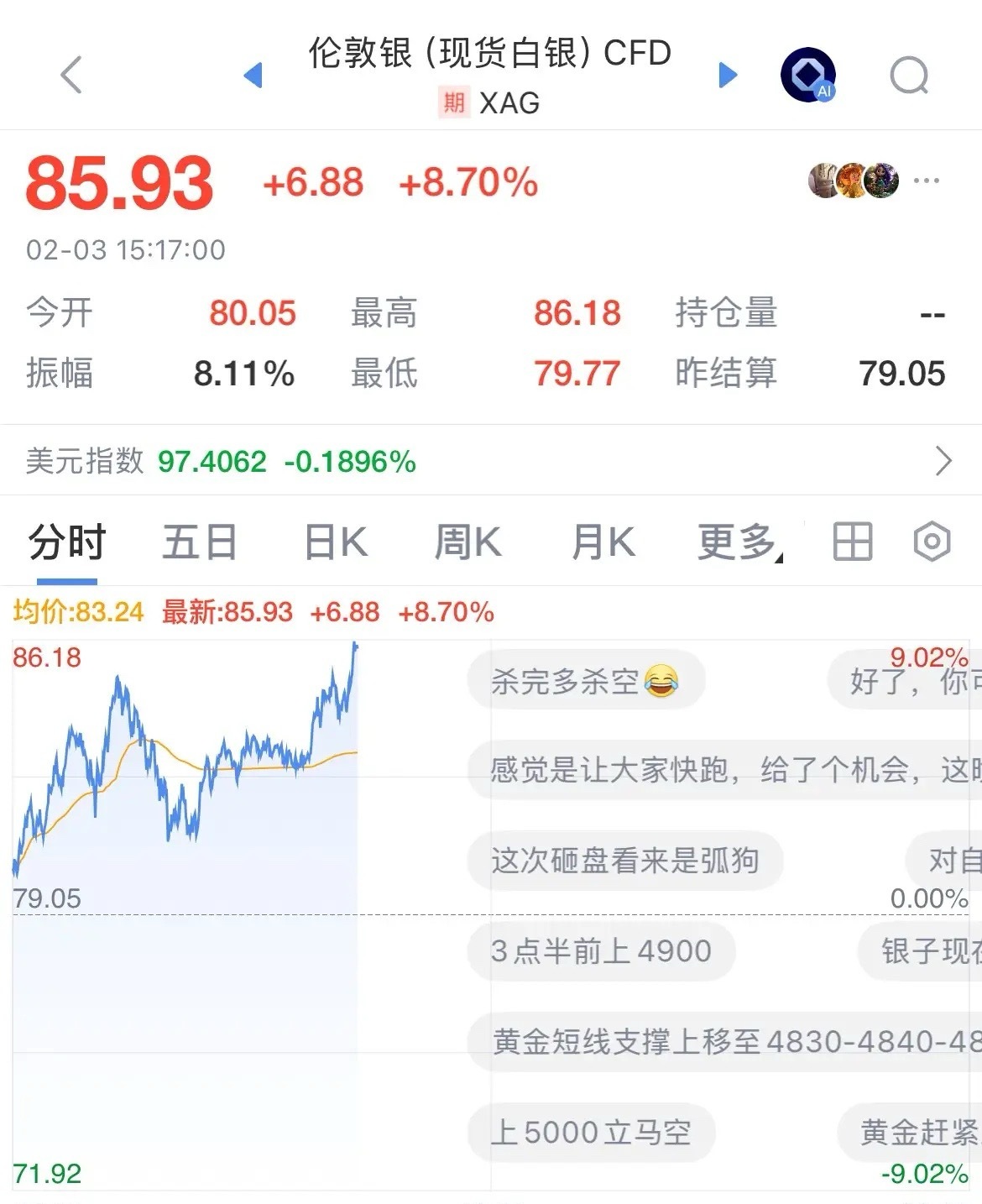 贵金属集体反扑,现货黄金大涨4%,逼近4900美元/盎司,现货白银大涨超8%,重回86美元/盎司,纽约期货黄金已经站上4900美元/盎司,纽约期货白银大涨11%,重回85美元/盎司