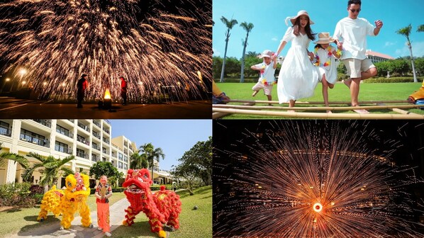节日的热闹,藏在每一处用心的安排里。除夕当晚,酒店大堂笑语融融,亲手包一枚饺子,便是家的温度。待到新年钟声敲响,古老的打铁花(年初一0:00、20:00、年初三20:00)将在沙滩夜空绚烂绽放,化作喜迎新春的璀璨星雨。大年初一,祥龙瑞狮欢腾起舞(10:58),为一年启幕讨个好彩头。在备受亲子家庭喜爱的新春游园会(年初二、年初五)上,竹竿舞节奏轻快,椰叶在指尖翻转成精巧物件,皮影戏幕布后光影生动——琼岛风情的年味,就浸润在这些可触可感的体验之中。