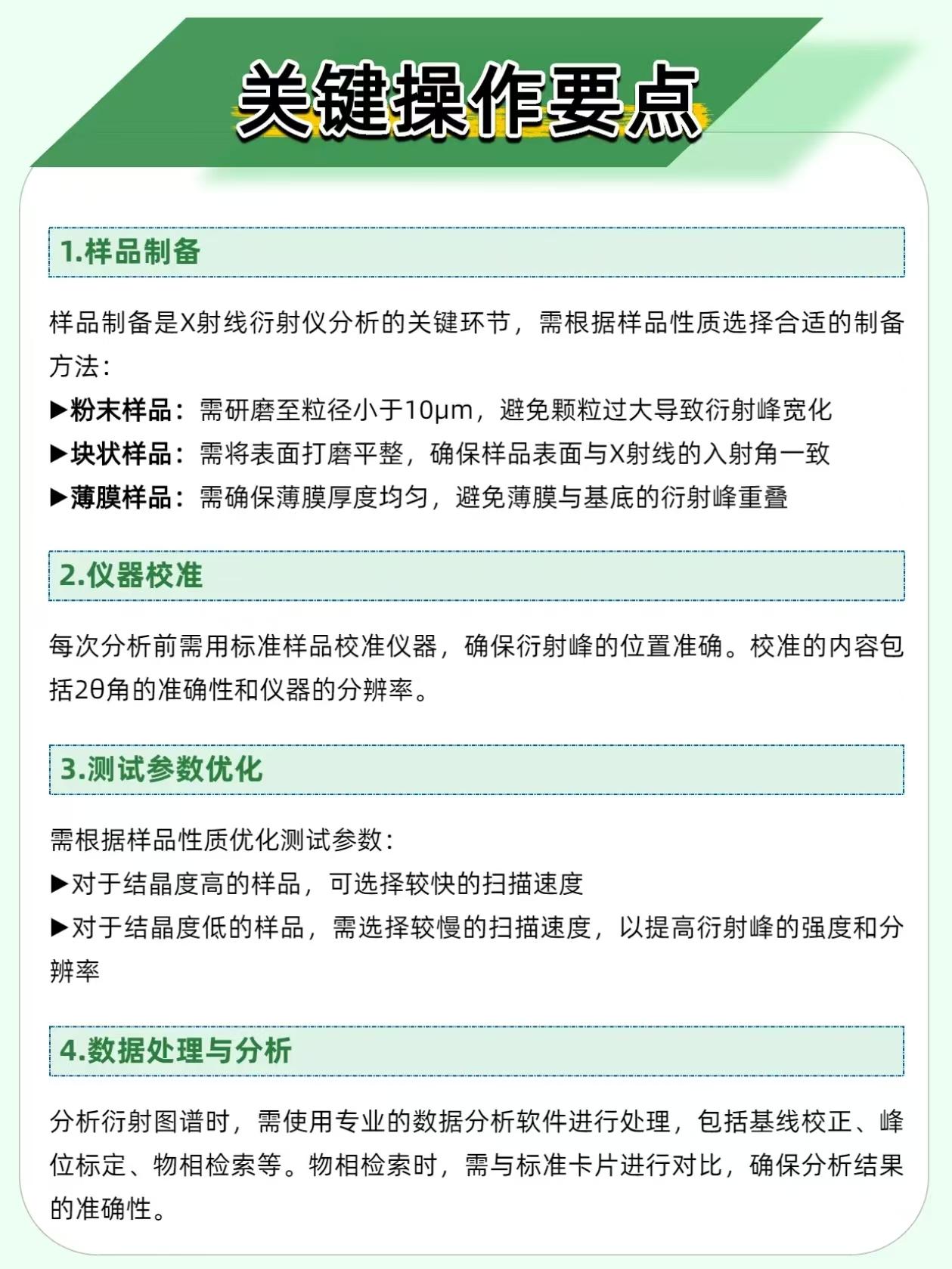 显微镜只能看表面?这台仪器直接看穿原子排列! 搞材料研发、药物分析,显微镜只能看表面形态,根本不知道原子怎么排?晶体结构才是性能的核心!X 射线衍射仪就是 “微观透视眼”,无损分析晶体结构,从原子层面看透物质本质! ✅ 核心优势,直接封神! ✨ 无损分析:珍贵样品、微量样品都能测,不会对样品造成任何破坏 ⚡ 快速高效:几分钟到几十分钟出结果,不用等几天 🎯 精准区分:不同晶型的物质都能分辨,药物晶型、材料性能全靠它 🧪 样品通吃:固体、液体、粉末都能测,材料、地质、文物全领域覆盖 💡 操作要点别踩坑! 粉末样品必须磨到 < 10μm,颗粒太大衍射峰直接宽化,数据全废! 块状样品表面打磨平整,确保 X 射线入射角一致,不然峰位不准! 每次实验前用标准样品校准,2θ 角准了,分析结果才可信! 不管是研发高性能合金、检测药物晶型,还是给文物做 “体检”,这台仪器都能搞定! 你有没有遇到过晶体结构影响产品性能的经历?评论区唠唠!