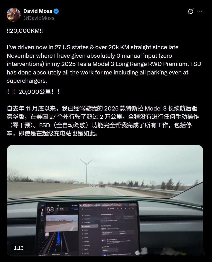 截至目前,车主DavidMoss 已创下连续行驶20000公里全程“零接管”的纪录,并且这一数字仍在持续刷新。