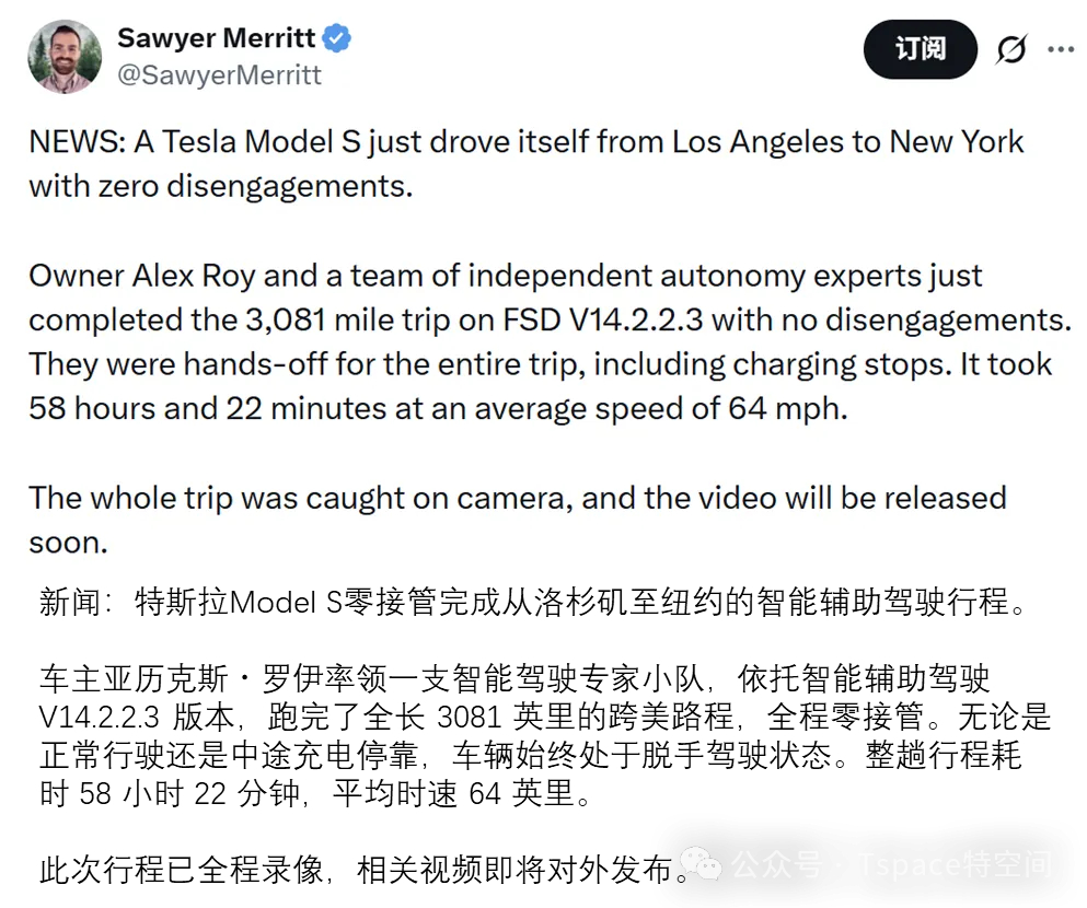 2025年的最后一天,来自美国的特斯拉车主DavidMoss 在社交平台上宣布,自己成功完成了全球首次仅凭特斯拉智能辅助驾驶系统横穿美国的旅程。