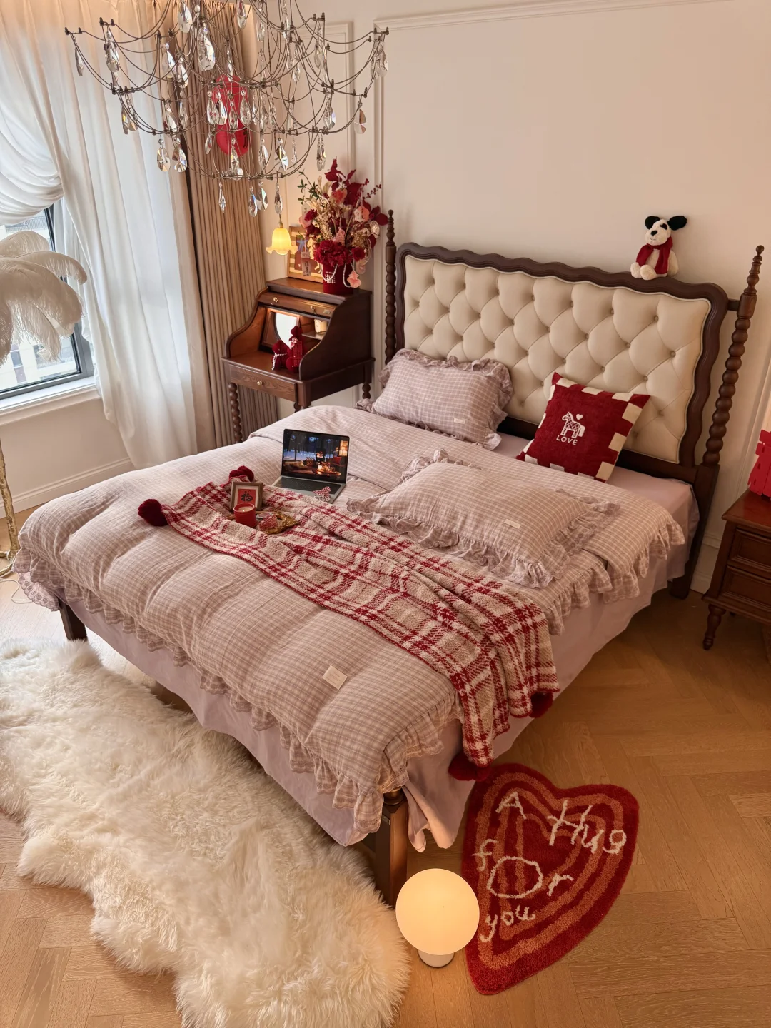 放了一块暗红色的爱心抱枕