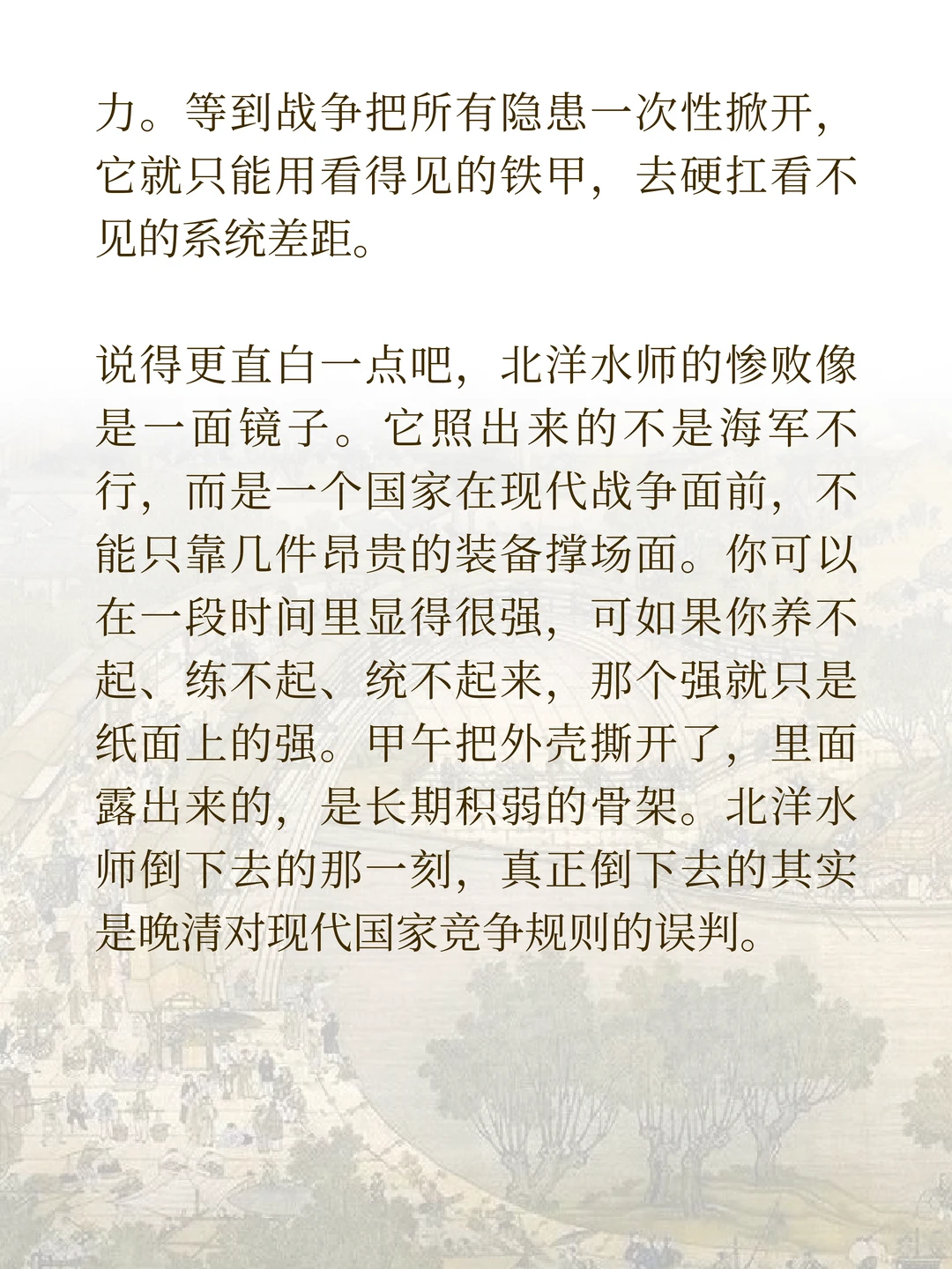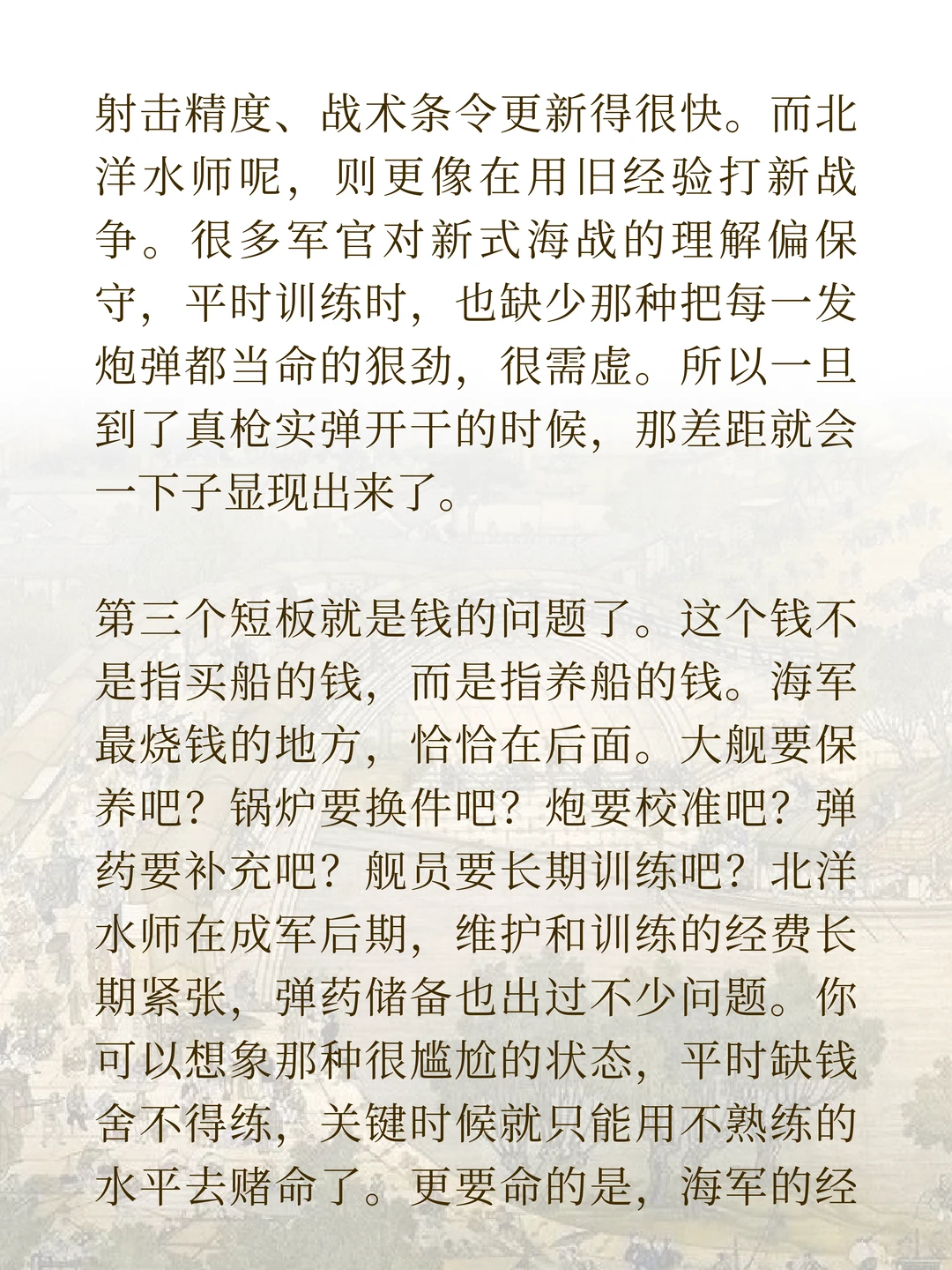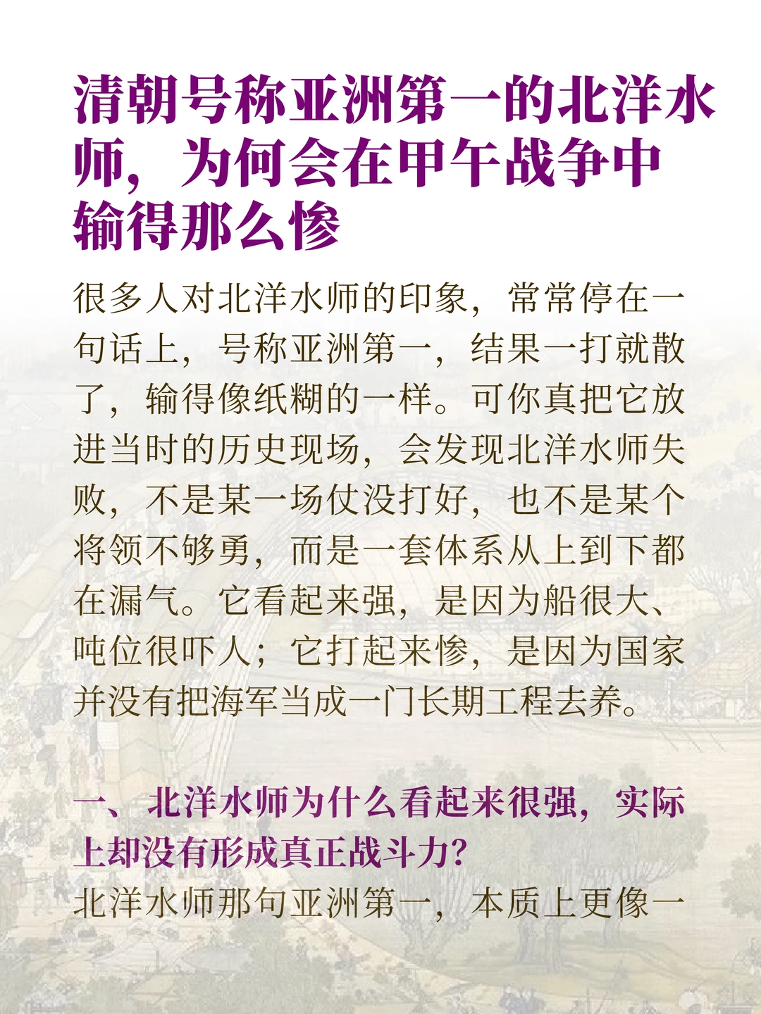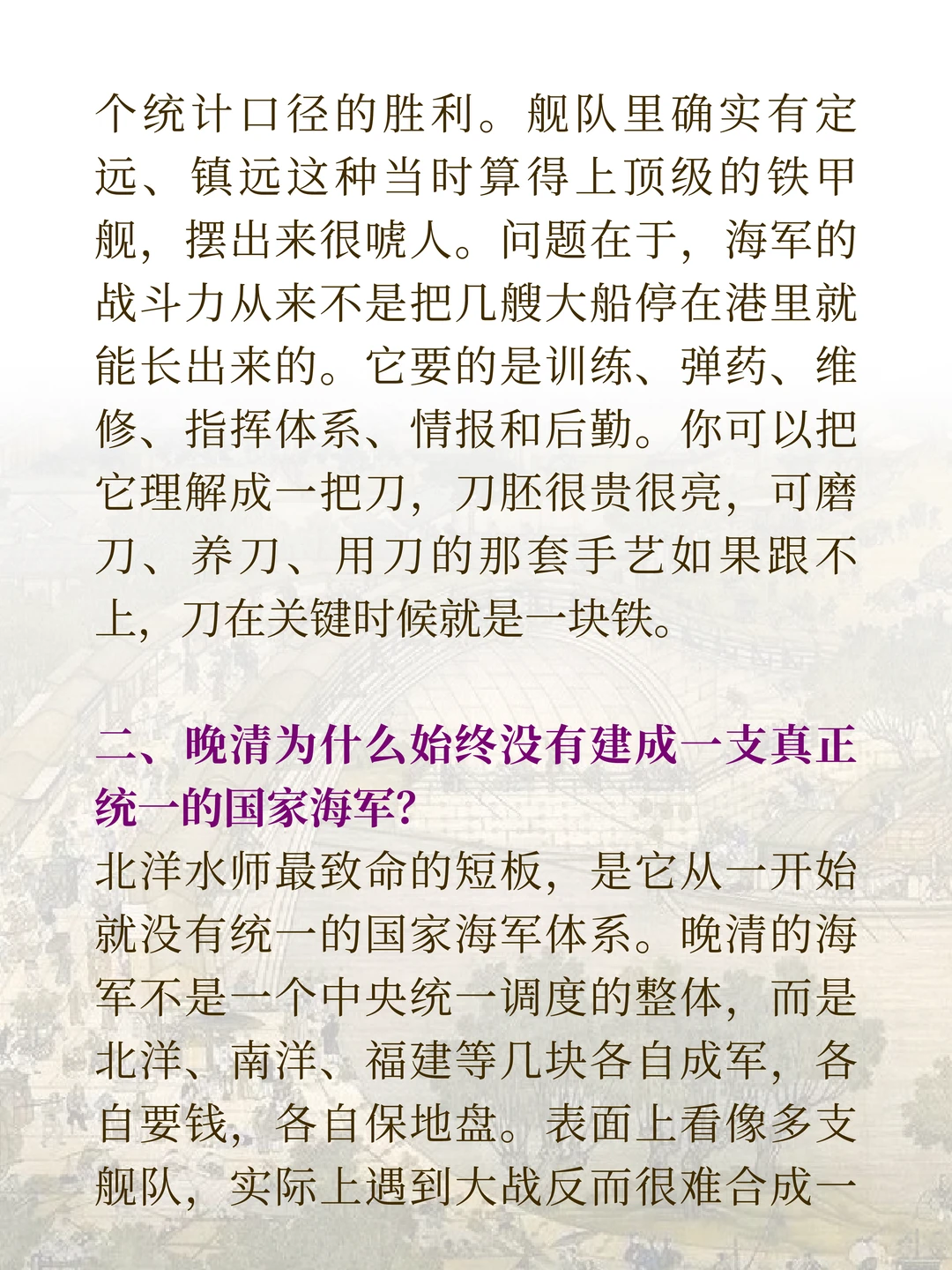 很多人以为北洋水师输在一场仗,其实它早在很多年前就开始慢慢输掉了。 船可以买,面子可以硬撑,但海军这种兵种的实力,是要靠国家一口气养几十年的才有的。 甲午战争真正打碎的,不只是几艘军舰,而是一个旧时代对现代战争规则的误判。