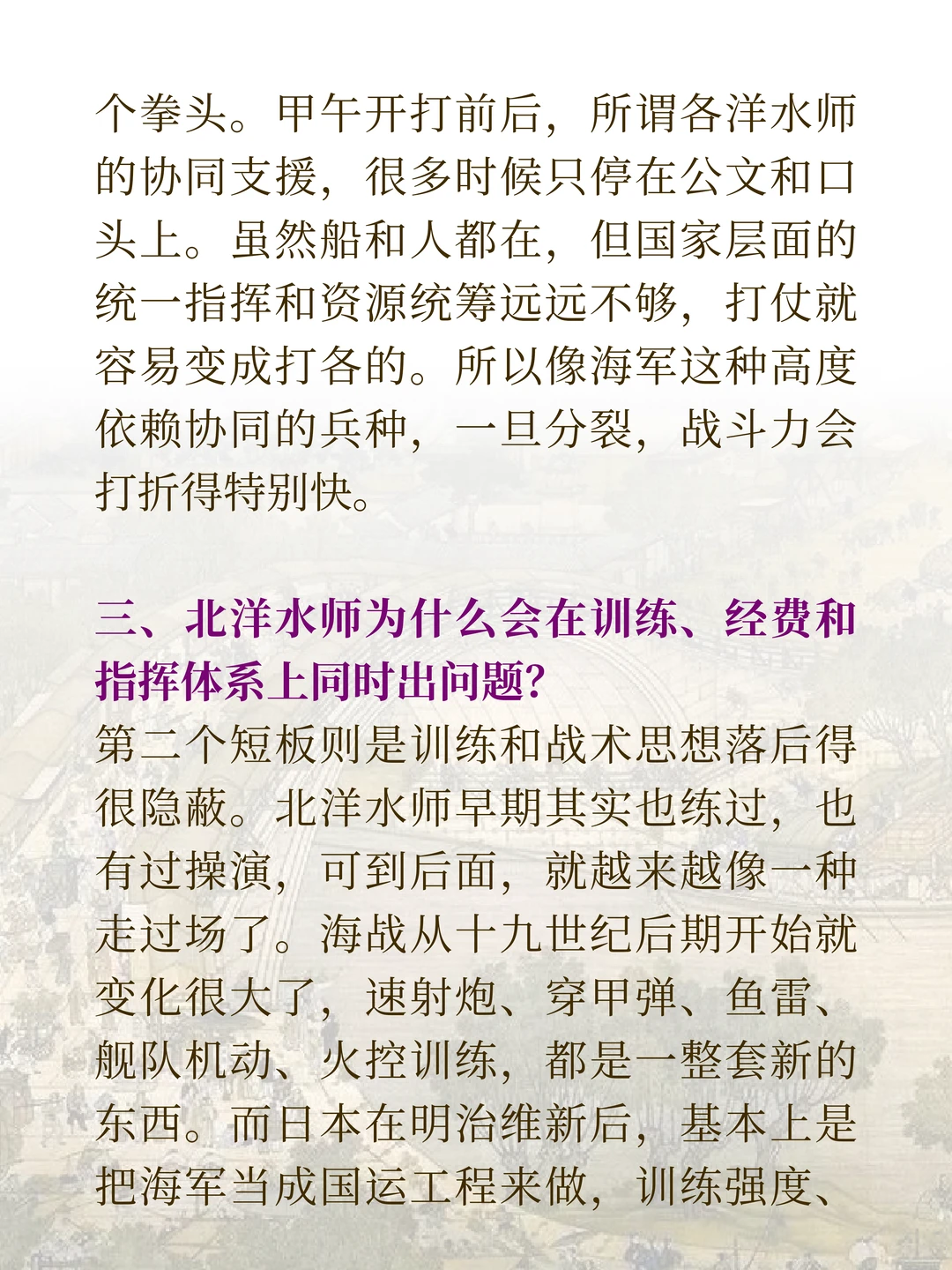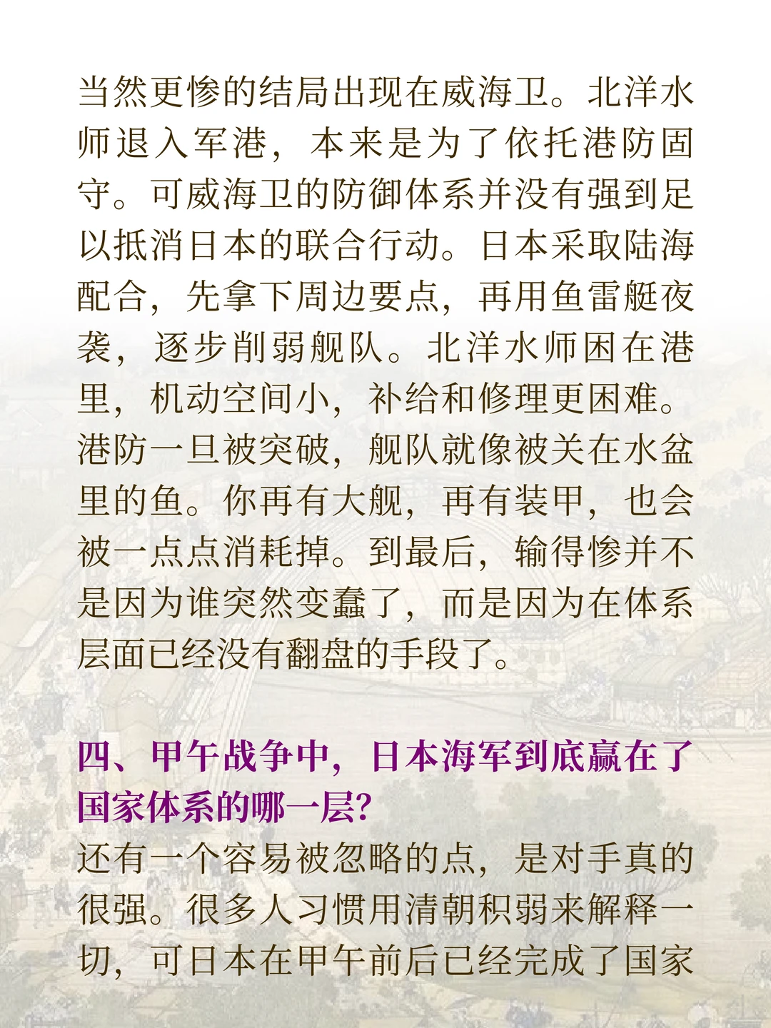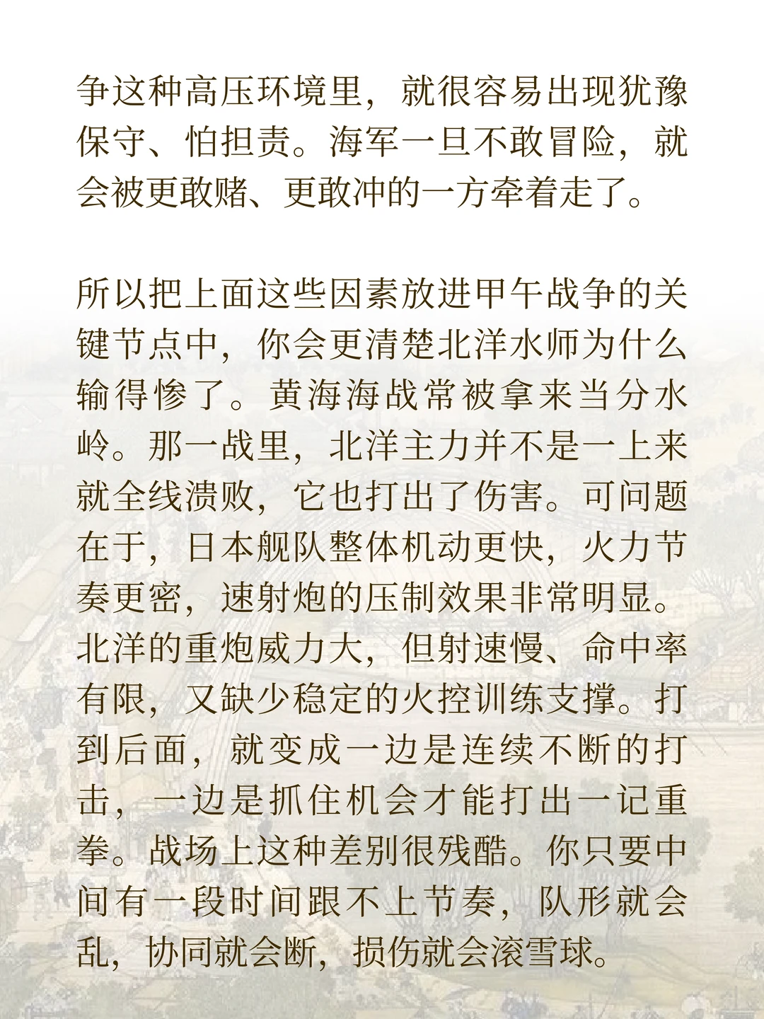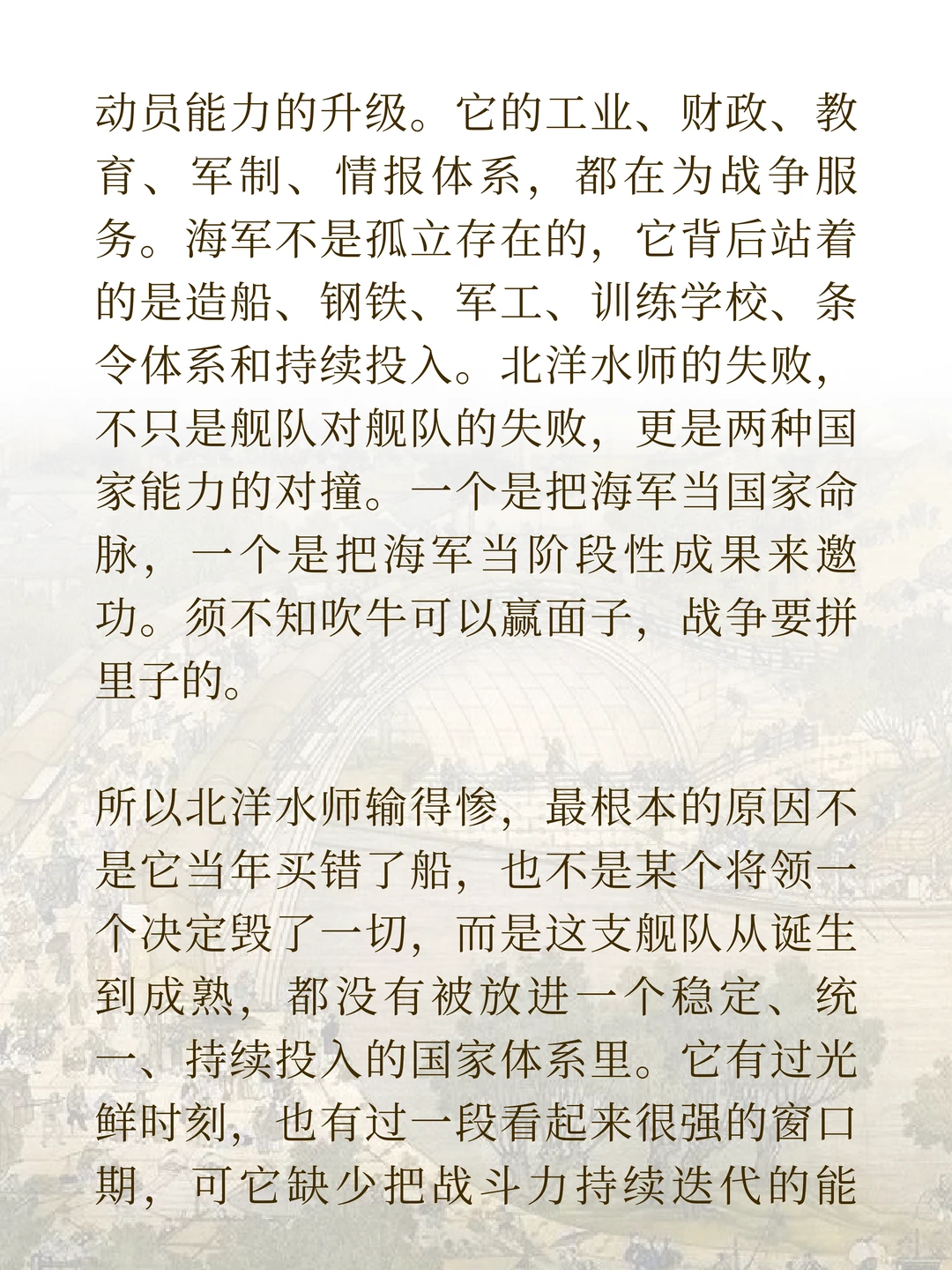 很多人以为北洋水师输在一场仗,其实它早在很多年前就开始慢慢输掉了。 船可以买,面子可以硬撑,但海军这种兵种的实力,是要靠国家一口气养几十年的才有的。 甲午战争真正打碎的,不只是几艘军舰,而是一个旧时代对现代战争规则的误判。