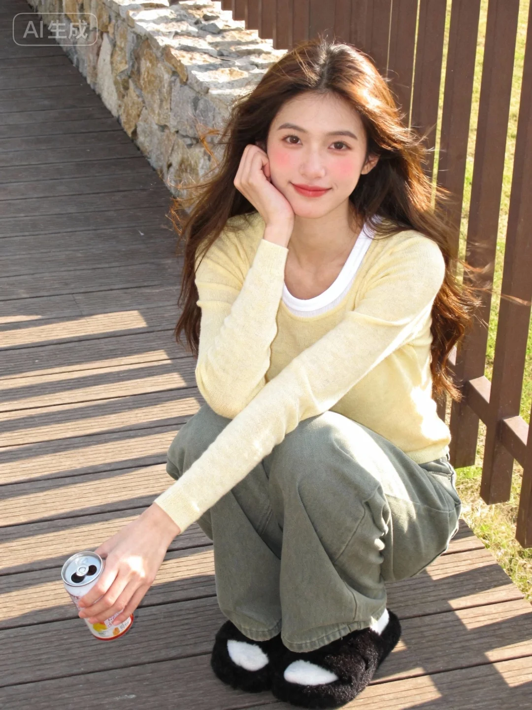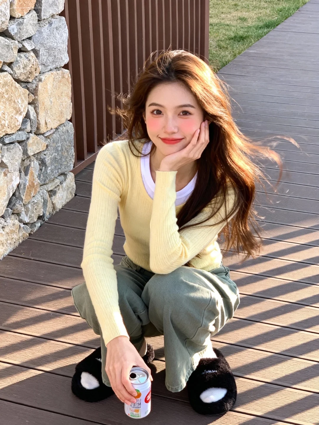 服饰配饰:浅黄色长袖针织衫(内搭白色圆领),灰绿色阔腿裤,黑色棉拖鞋,手持罐装饮品