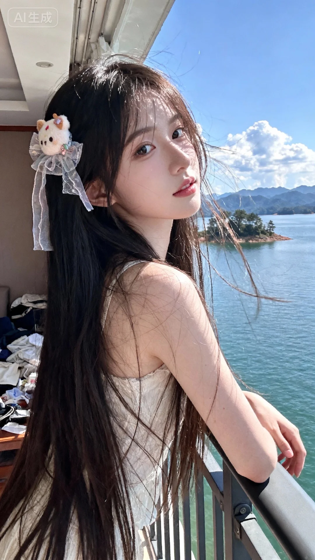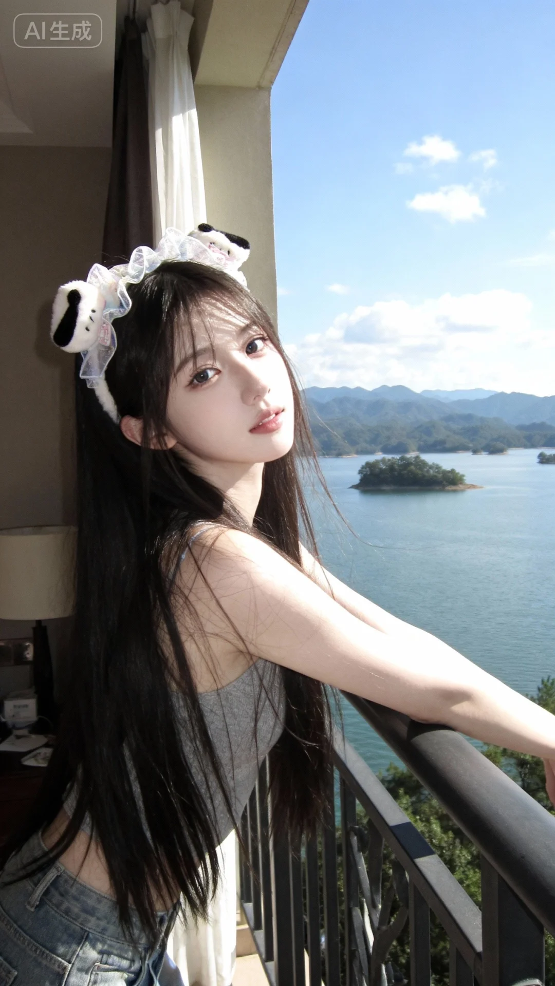 靠在小岛湖边栏杆上,栏杆后边千岛湖风光,山水如画,极致美景,蓝天白云,晴空万里。