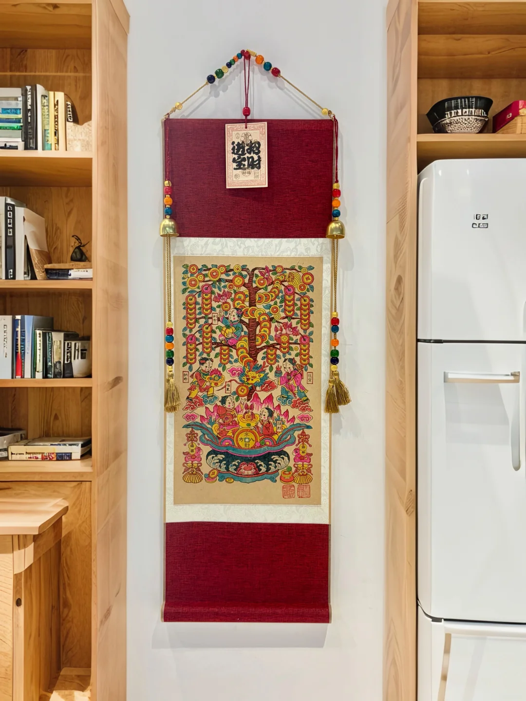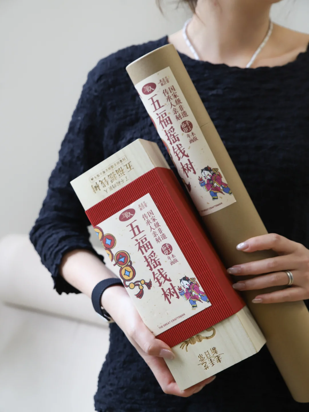 近几天都被新春市集再不入手五福摇钱树 你糊涂哇!! 我们首次把年画和红色卷轴组合 把新年氛围营造得满满 这一次你不需要装裱 就能拥有一幅带来好运、可装饰的挂画 选择了杨家埠年画的传统题材-摇钱树 经过重新设计后画面更加灵动 五位童子在不同方位为你zhaocai 聚宝盆、摇钱树.... 特意加了印金 阳光下会闪闪发光~ 调研之初参考大家意见 我们加入五彩铃铛🔔 跟家居风格不会冲突 礼盒我们也有改进 桐木礼盒送人特别有仪式感 还可以写心愿卡 祝你2026愿望达成