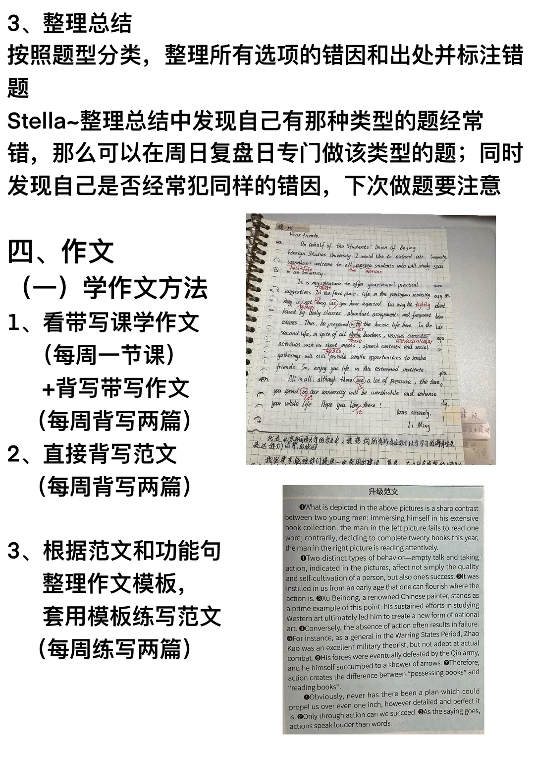 4、作文→每天背写/练写2篇作文;每周整理2~3篇作文模板