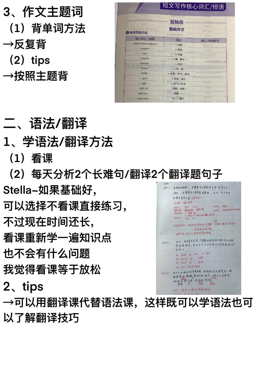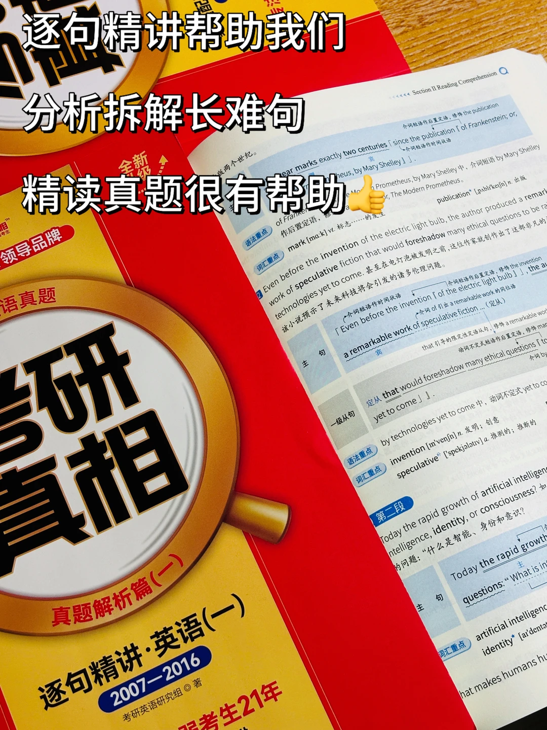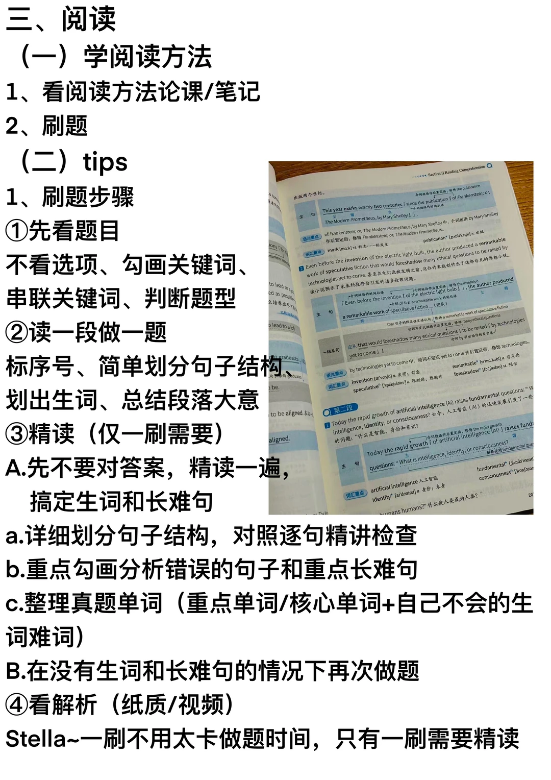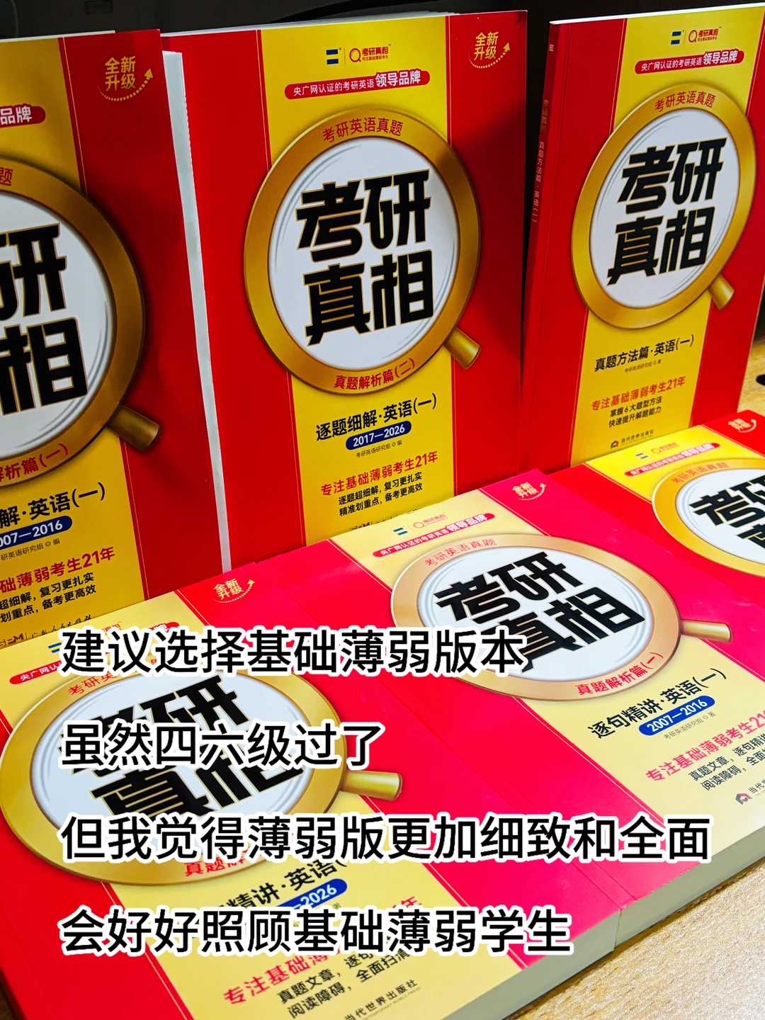 Stella~背完一轮单词后可以开始刷题了,考研英语只用刷往年英语真题,不知道选择什么版本的,选《考研真相》已过四级版,因为真题讲解更加详细(正确选项和错误选项逐个剖析)而且资料丰富,能帮助我们更好地打基础;当开始刷题,就需要整理真题单词,真题单词=重点词汇(《考研真相》的真题配套词汇,是按照真题文章顺序整理生词的)+对自己做题有影响的生词难词;一轮刷题可以精读→划分句子结构+口译,可以借助逐句精讲检查句子的划分情况(逐句精讲册会对每一句话进行拆解:标注句子主干与修饰成分,吃透每个句子)