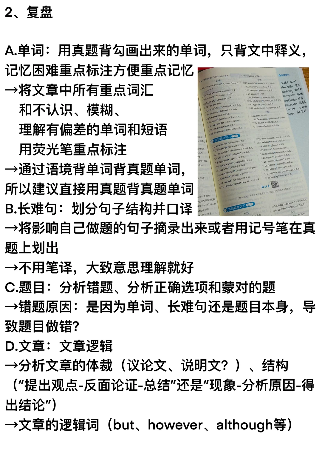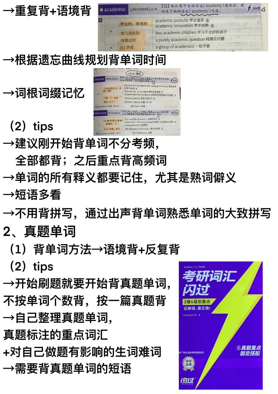 1、单词→每天背单词;每天至少一篇真题单词