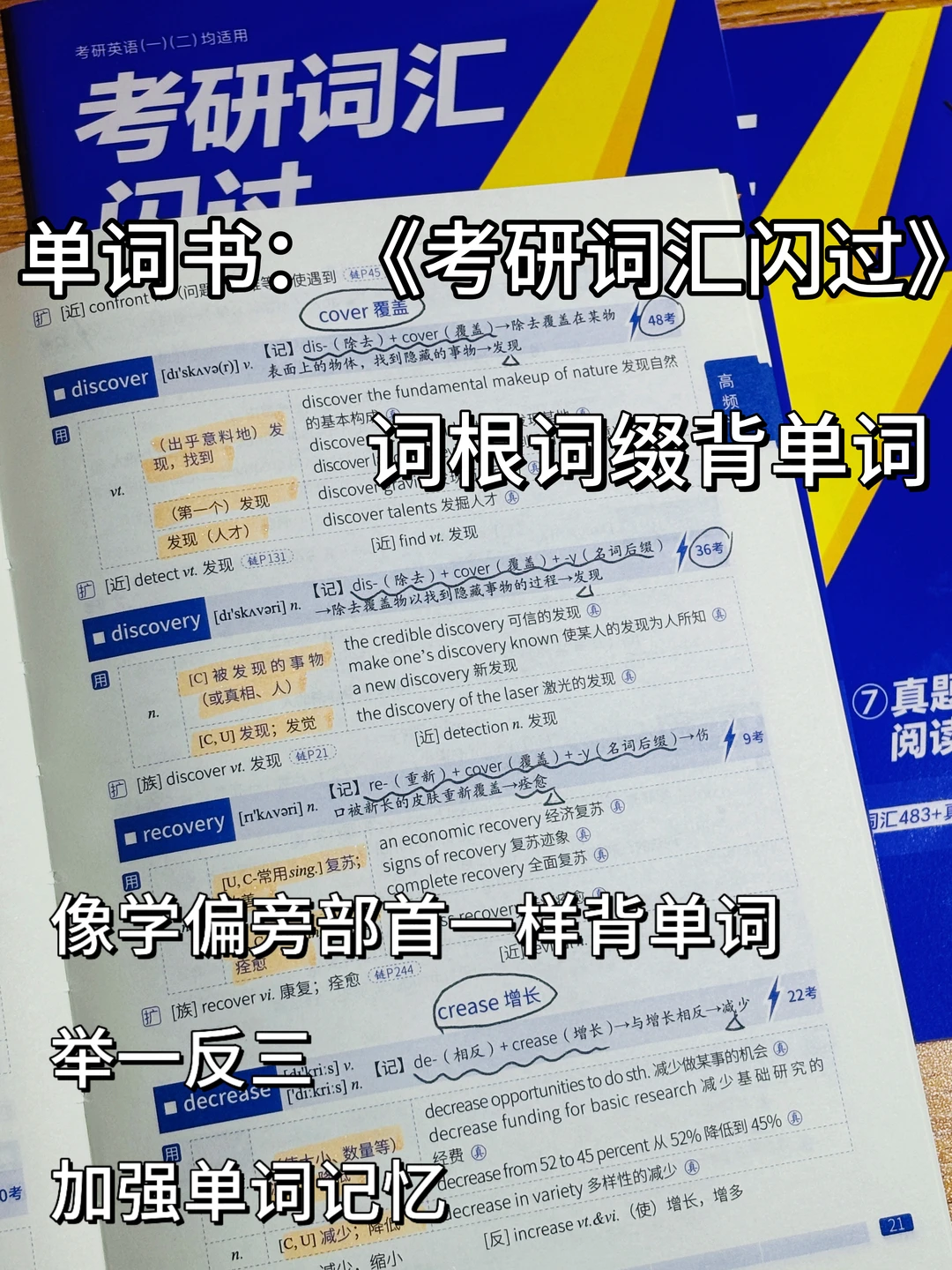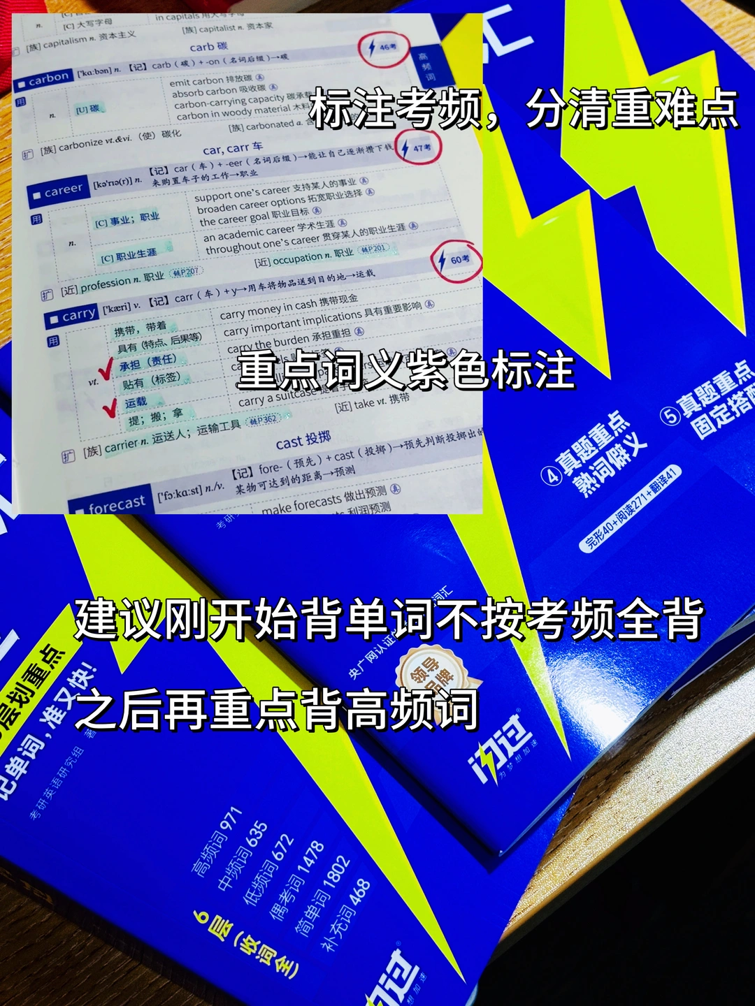 Stella~刚开始背单词建议先用纸质书背单词→跟着《考研词汇闪过》自带的音频一边读,一边记单词,背完一页的单词后,回到开头的学前检测即时坚持背诵效果,难记忆的单词重点标注;另外,闪过它的词书是按照考频(高频、中频、低频、偶考、简单、补充)排版的,所以大家在背的时候能分清背诵的主次,不过刚开始背单词,建议大家不分考频全部都背,等背完单词1~2轮后,大家可以重点背高频(中频和低频也可以背背)