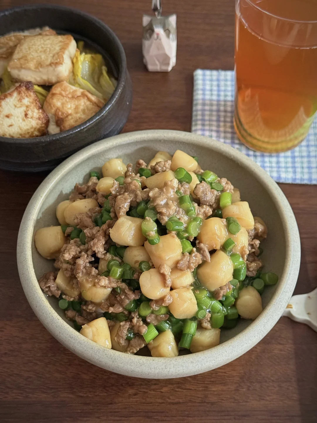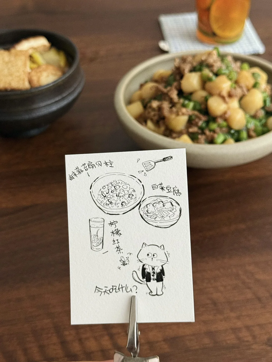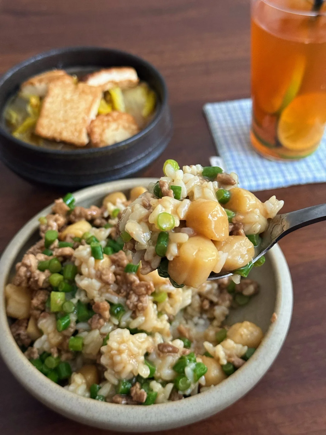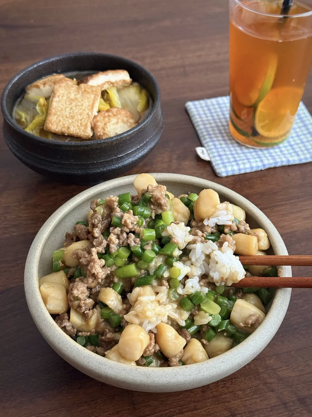 扇贝柱QQ弹弹裹着鲜汁,肉末焦香混着酱汁裹满米饭,配着软乎乎的白菜豆腐,再喝一口冰爽柠檬红茶,浓郁和清爽撞个满怀,十分钟搞定的一人食,仪式感和满足感全拉满!