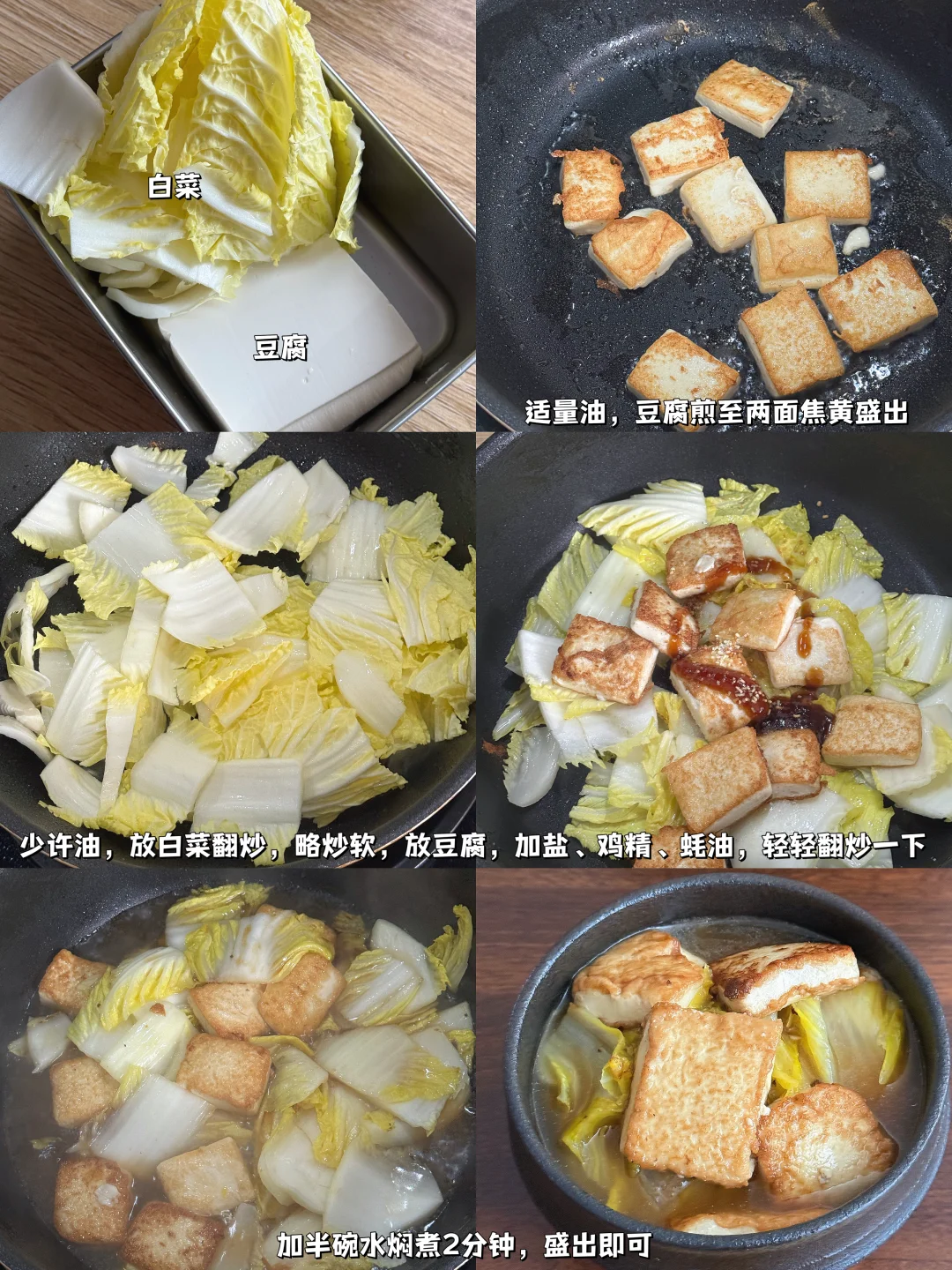 2. 留底油,下白菜片炒软,倒回煎好的豆腐,加少许盐、鸡精,一勺蚝油轻轻翻拌