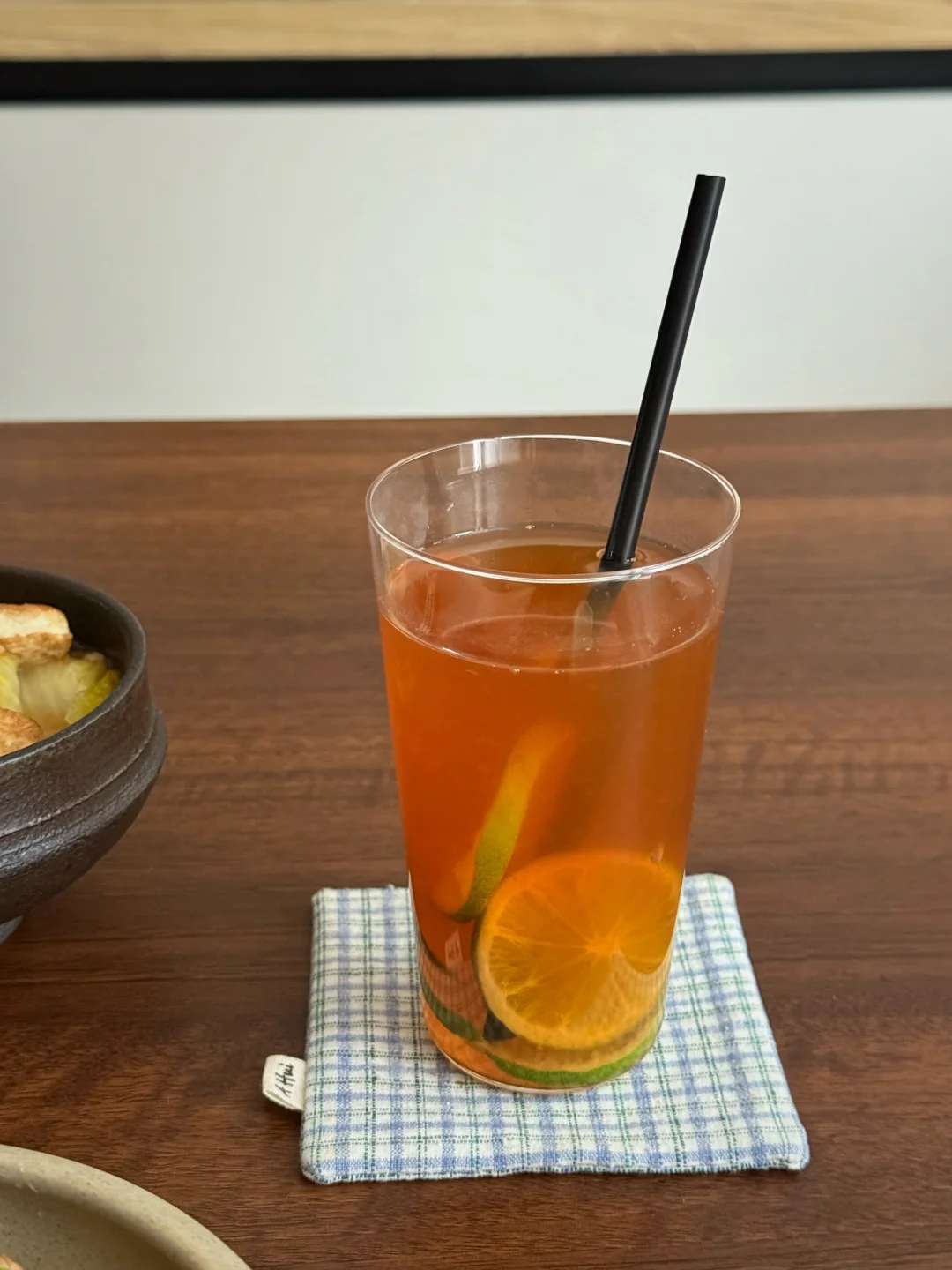 2. 茶汤放温热倒玻璃杯里,重新放两片柠檬