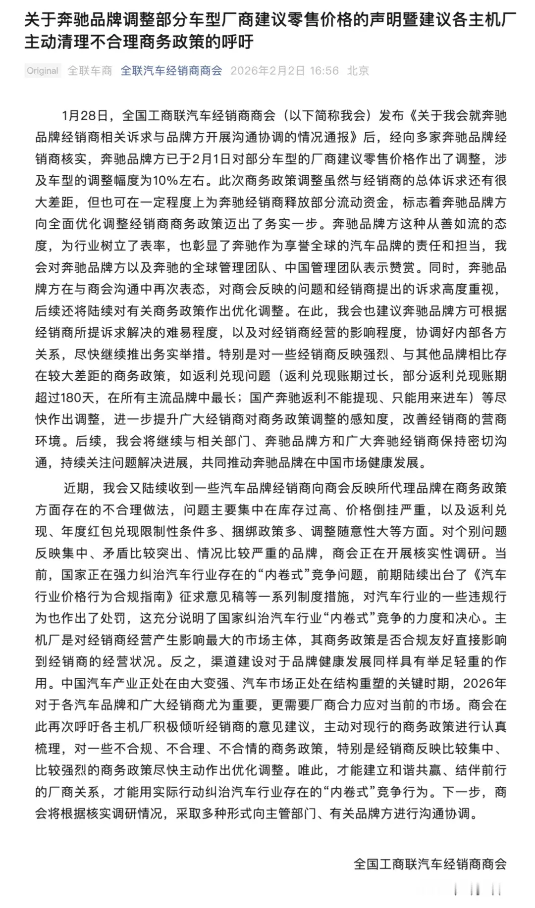 奔驰官宣降价!都没达到经销商满意,客户会满意吗?全联车商证实,奔驰2月1日下