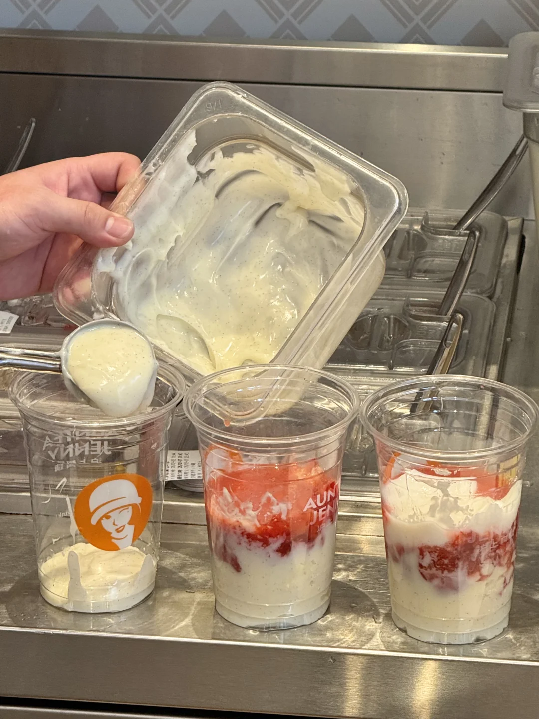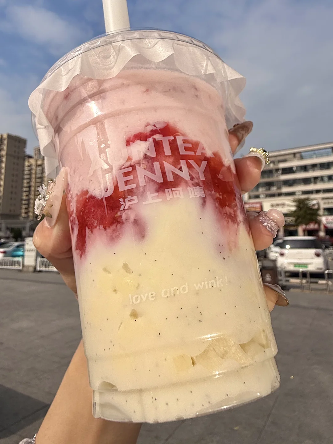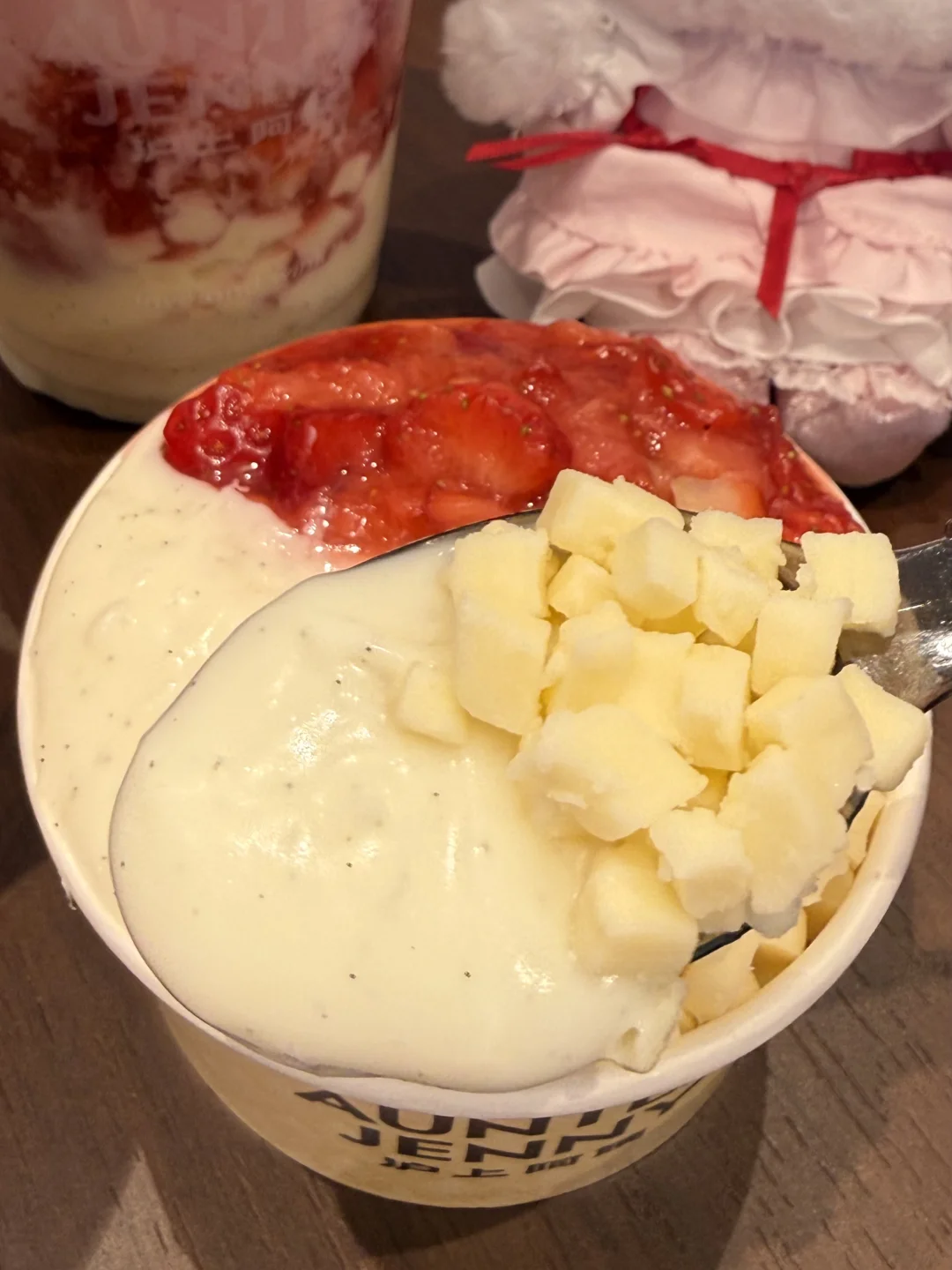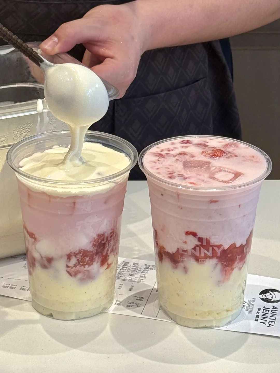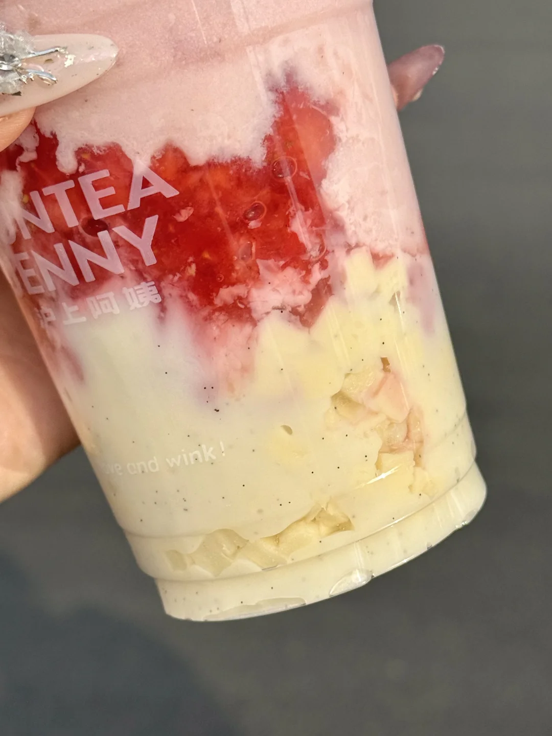 一口下去好喝到打鸣……马上喝上瘾了!底部的马达加斯加香草籽芝士干酪夹着芝士丁,根本就没有难喝的余地。。芝士奶香浓的要命!特别像在吃一块草莓香草巴斯克!!里边还有草莓果肉,加份米麻薯口感更糯叽,太妙了!!! 还点了杯加奶冻和奶盖的搭配也很奈斯!记得搅匀奶fufu的,幸福晕了我直接十分钟吨完。