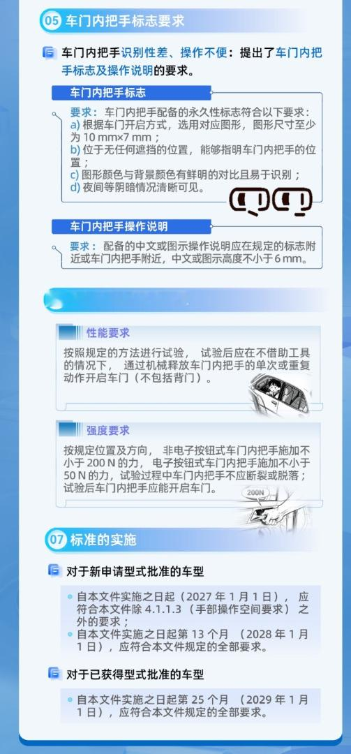 千呼万唤始出来!汽车门把手的强制性国标终于落地了,一图看懂是怎么个事儿。划重点:这不是建议,是强制!内外必须配机械把手,安全底线焊死了,专治那些为了颜值不顾安全的设计。新规明年1月1日起执行,半隐藏式只要达标就OK,大家不用慌!【来自懂车帝车友圈】