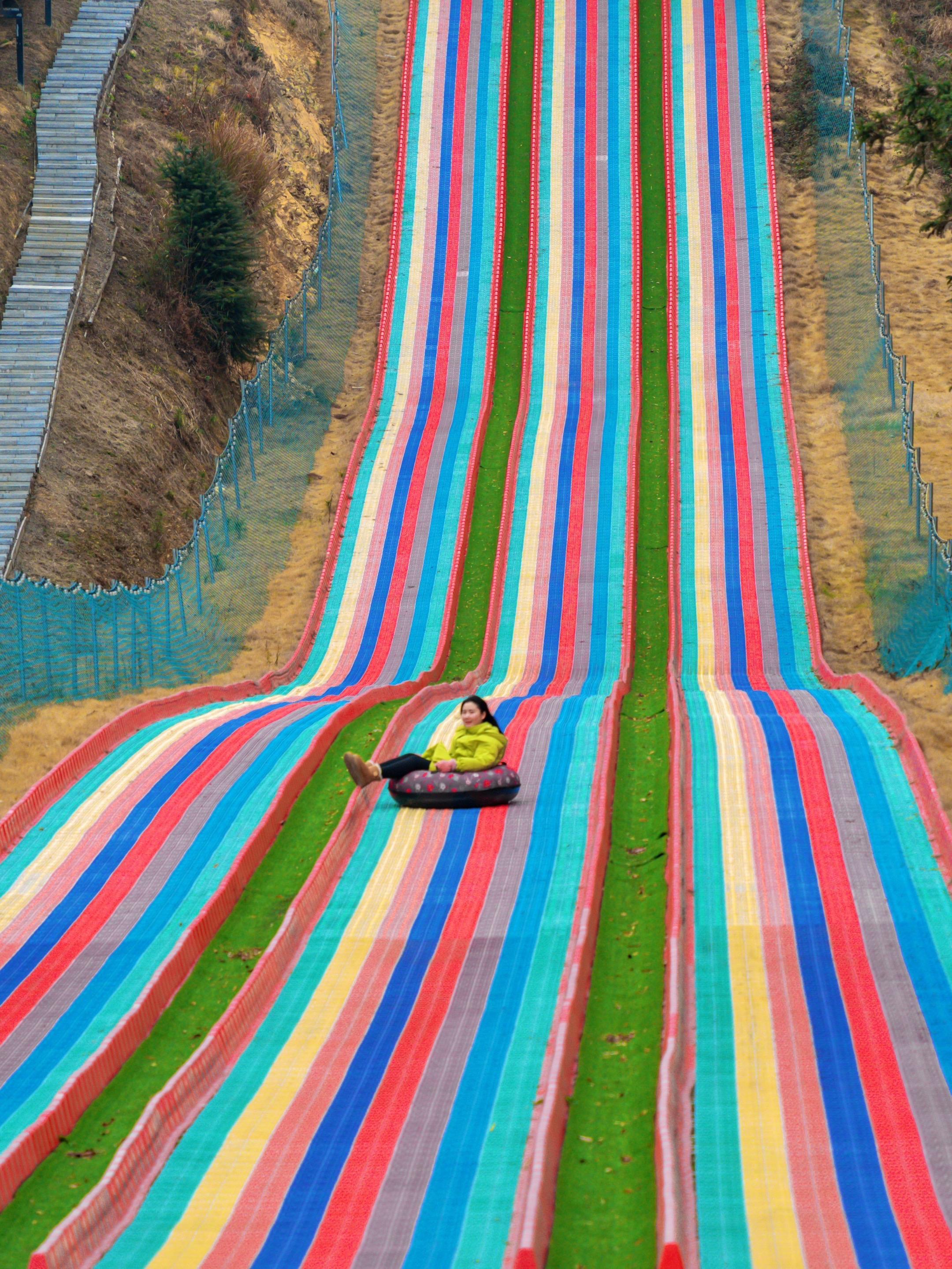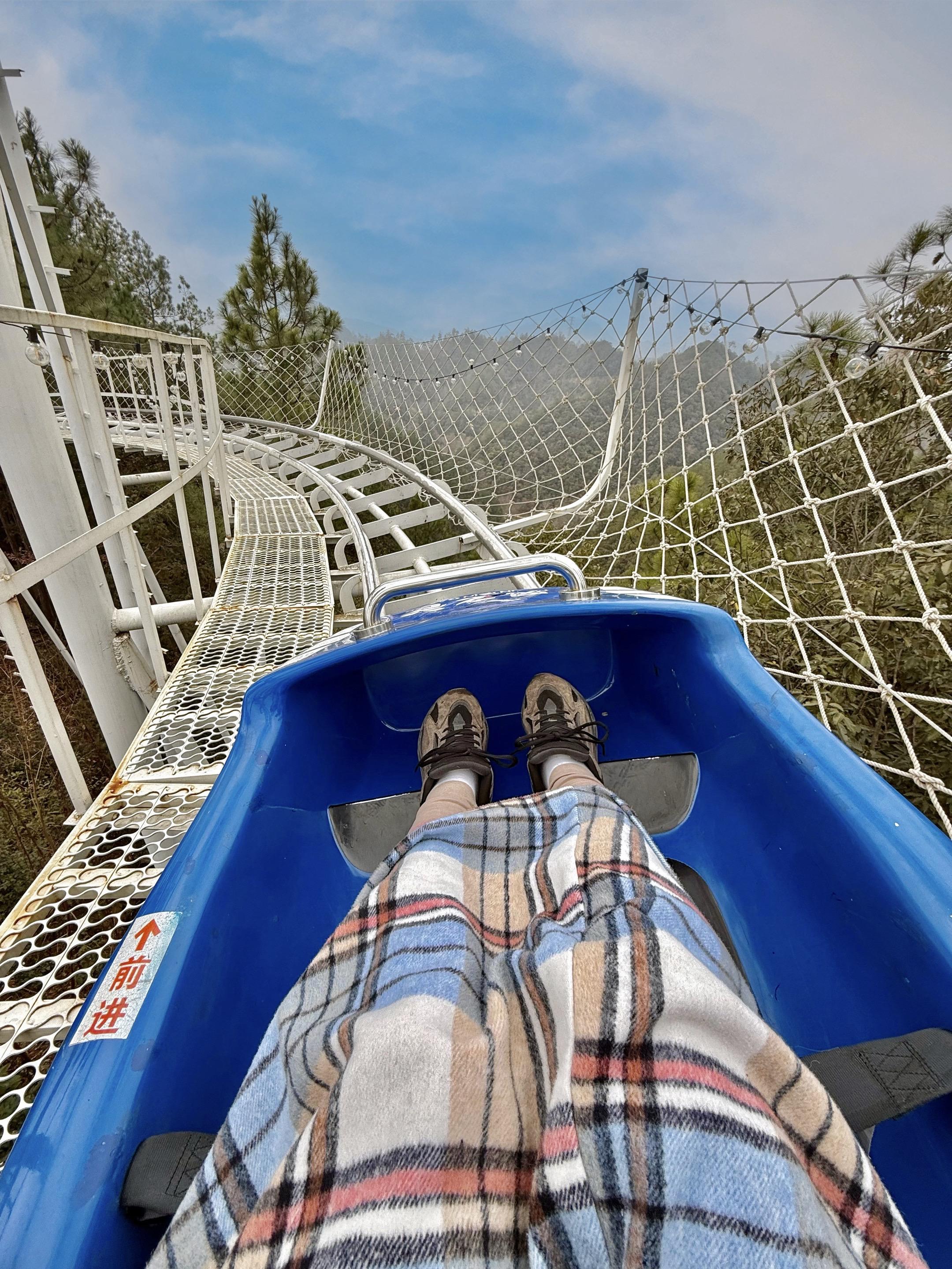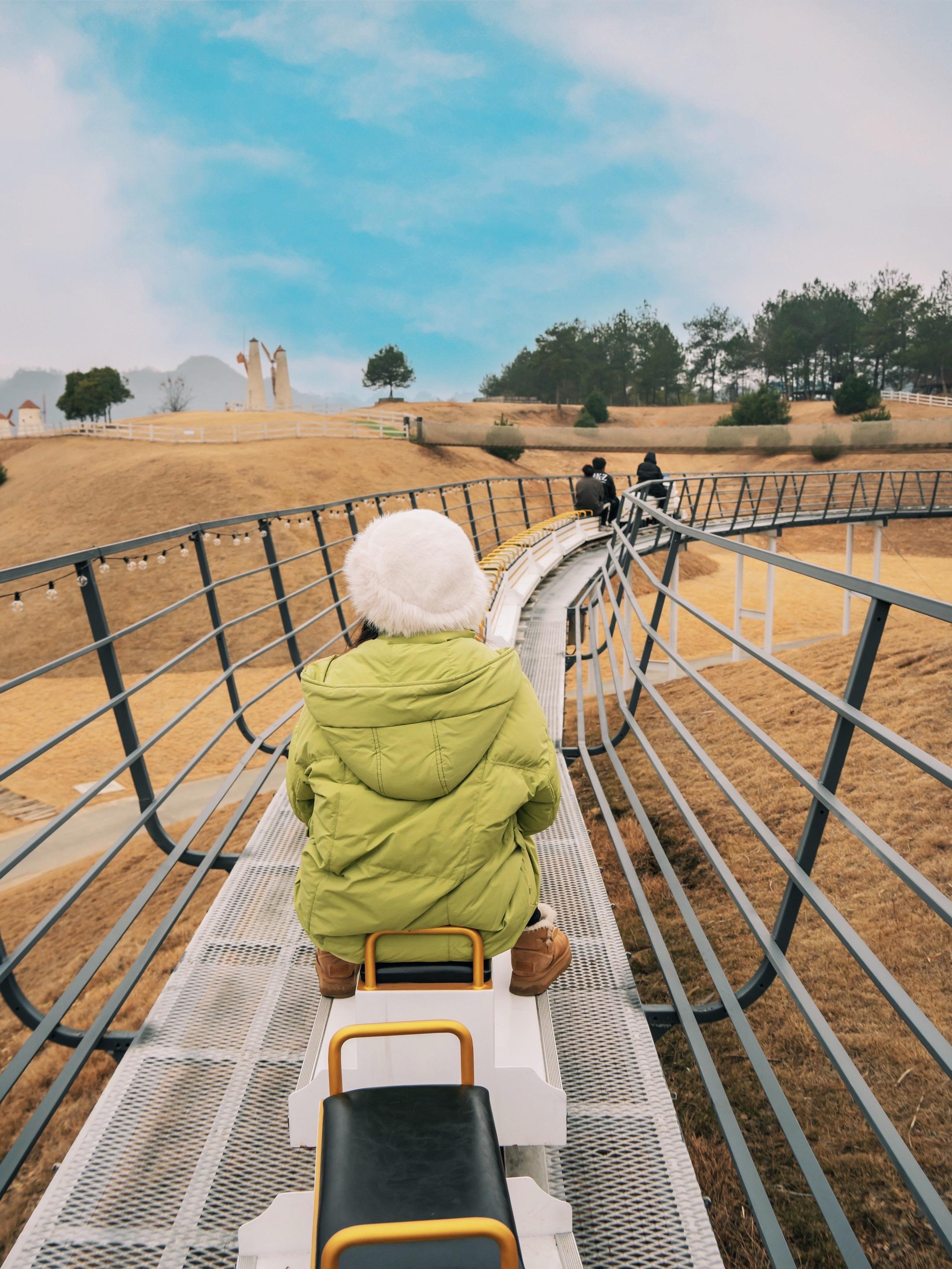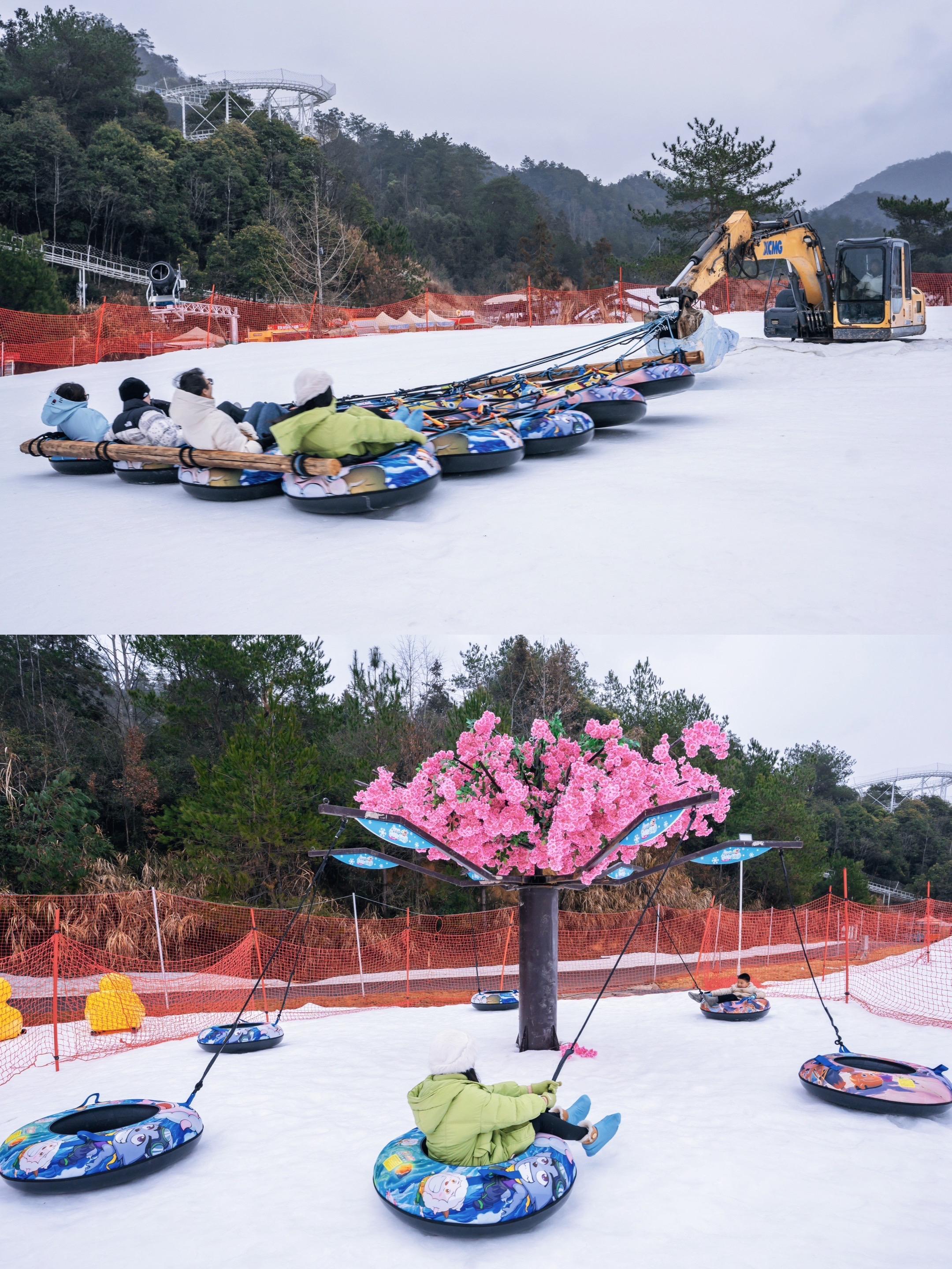 雪圈漂移,从高处滑下来,滑道有设置弯道,很有趣