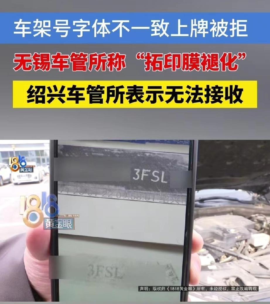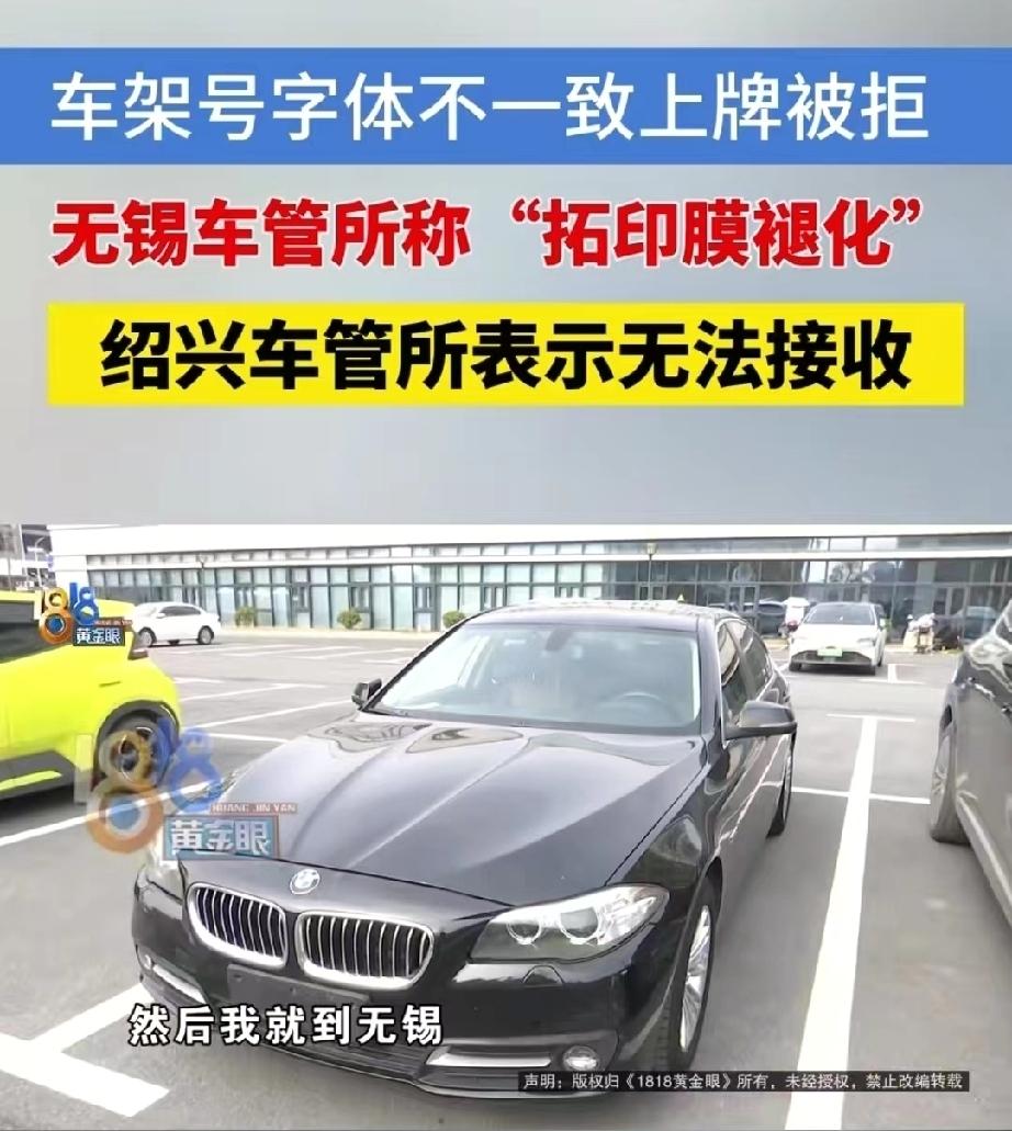 浙江绍兴,男子做二手车生意,他从无锡买了辆2015年的宝马五系,本打算尽快落户赚个差价,谁知上牌照时,车管所工作人员说车架号的字体上不一致,没法上牌。男子懵了,赶紧跑到无锡车管所,那边称是拓印膜褪色了,属于正常现象,不影响落户,并出了一份说明。谁知,绍兴车管所并不认可,这下,可把男子难住了。 魏先生在绍兴做二手车生意,平时买卖车辆、办理过户都算顺利,没想到最近收的一辆车,却让他碰上了一件头疼事。 1月19号,他在二手平台上看到一辆无锡的个人车源,是辆2015年的宝马五系,价格合适。 魏先生没多想,就直接赶去无锡,从卖家手里买下了这辆车。 当天,他就到无锡车管所办好了提档手续,心里还盘算着,抓紧时间回绍兴就能把牌照落上,这辆车很快就能转手,很快就能赚一笔。 没想到,问题就出在落户这一步。 绍兴车管所的工作人员在核对档案时,发现实车车架号的拓印膜,和系统电子档案里留存的“车架号字体”对不上。 虽然数字和字母一模一样,但一个是印刷体,另一个是拓印的实际字体。 工作人员当场就给他打了退办单,理由写着,实车车架拓印膜与注册登记车架字体不一致。 魏先生有点懵,车架号明明是一样的,怎么字体不一样就不能落户? 他看了看车管所提供的对比照片:上面是实车拓印的模样,下面是电子档案里的图样。仔细看,字体确实有差别。 这下他急了,车款六万多已经付了,牌照落不了,这辆车就动不了,也没法卖。难道只能上无锡牌照吗?那在绍兴做生意就太不方便了。 为了弄明白原因,魏先生又跑了一趟无锡车管所总所。 那边的工作人员向他解释说,这辆车2015年首次登记时,车管所把车架号打印在了查验单上,同时又把实际拓印的膜贴在同一处。 时间久了,拓印膜褪色,底下打印的字体反而透了出来,所以现在电子档案里存的是打印字体,并不是原车拓印的效果。 就像铅笔字时间长了会淡掉一样,早年这种材质可能不过关,当时这种操作,可能存在瑕疵。 他们还出具了一份四五百字的情况说明,证明这类情况不在少数,很多转出车辆都附了类似的说明,最后都顺利落户了。 本想着有官方说明总该没问题了,他带着文件回到绍兴车管所,谁知,窗口仍然不给办理。 对方表示无法接收这份说明,档案问题他们解决不了。 魏先生既无奈又窝火,无锡说档案不能改,改了就是造假,但不改又上不了牌照,到底该怎么办呢? 一辆车明明手续齐全,却卡在两个车管所之间,进退两难。 无奈之下,魏先生向记者求助。随后,记者联系了无锡车管所,工作人员再次回应,提档时他们已经重新拓印车架号并上传系统,但2015年原始登记的那张查验单确实无法更改。 他们也和绍兴车管所联系过,但问题还是没解决。 依据《机动车登记规定》第54条,车辆管理所办理转移登记时,需查验车辆识别代号拓印膜等,确认与登记信息一致方可办理 。 本案中,魏先生车辆因原始登记查验单拓印膜褪色致档案字体与实车拓印字体不符,绍兴车管所退办符合查验规范。 无锡车管所出具的情况说明,属证明登记瑕疵的有效材料,并非档案造假 。 魏先生可要求无锡车管所按规定重新核验并出具更正说明,协调两地车管所按规范流程处理。 若因登记机关过错导致无法过户,可依法申请更正登记或通过行政投诉、行政复议等途径维权,以解决手续合规却无法落户的困境。 眼下,魏先生只好做最现实的打算,要么先上无锡牌照,要么寻找其他城市的客户接手。 原本想顺利倒手赚个差价,没想到因为一个“字体”问题,折腾了这么多天,生意没做成,还搭进去不少时间和路费。