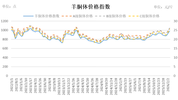 2月2日,怀仁羊胴体价格指数报981.78点,较上期上涨2.35%,A级胴体价格报25.66元/斤,较上期上涨0.30元/斤,涨幅1.18%;B级胴体价格报26.23元/斤,较上期上涨0.62元/斤,涨幅2.42%;C级胴体价格报25.67元/斤,较上期上涨0.95元/斤,涨幅3.84%。