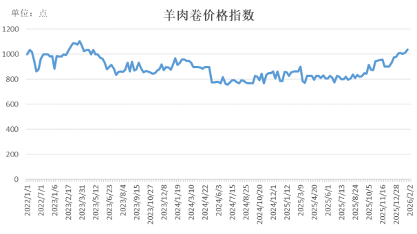 2月2日,怀仁羊肉卷价格指数报1036.38点,较上期上涨2.40%,价格报60.11元/公斤,较上期上涨1.41元/公斤。