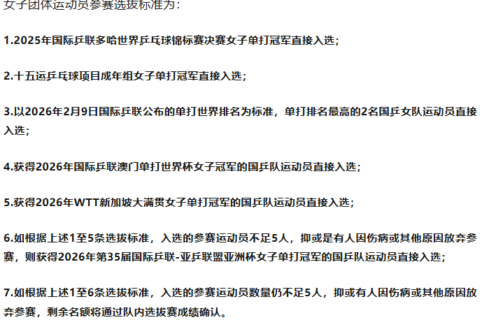 根据《伦敦世乒赛团体赛选拔办法》,2025年国际乒联多哈世界乒乓球锦标赛决赛单打
