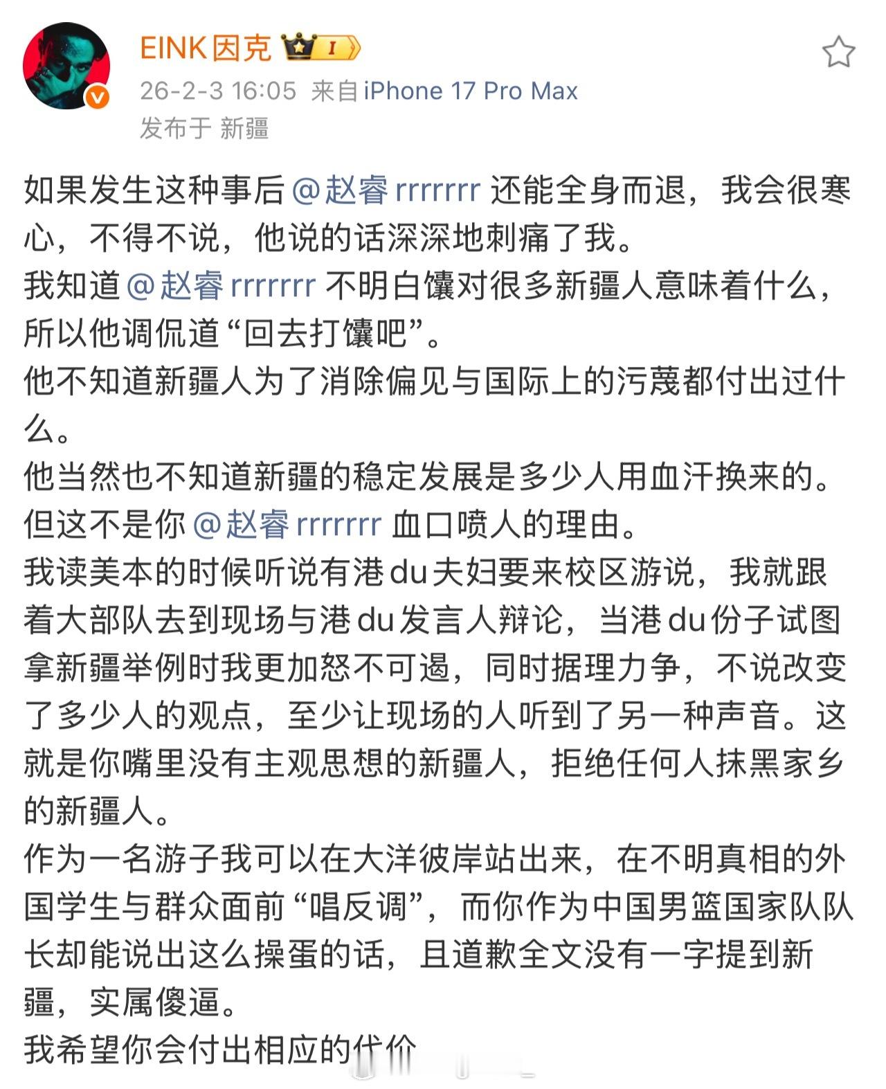 赵睿新疆球迷争议言论 2727厂牌成员Eink直接开怼CBA赵睿:他说的话深深地刺痛了我,你作为中国男篮国家队队长却能说出这么操蛋的话,且道歉全文没有一字提到新疆,实属傻X!