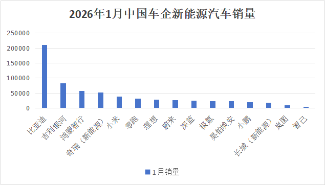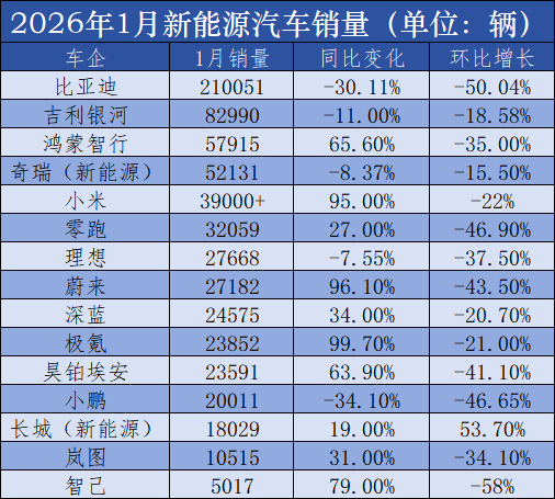 2026年1月,15家车企的新能源汽车合计销量超61.56万辆;15家车企中有14家车企的月销量超过1万辆。比亚迪仍旧遥遥领先,但其遭遇严峻挑战,同环比均大幅下滑;吉利银河虽然同环比均有下滑,但仍稳居第二,且受影响相对较小,若加上极氪、领克等品牌,吉利汽车新能源汽车销量超过12万辆。