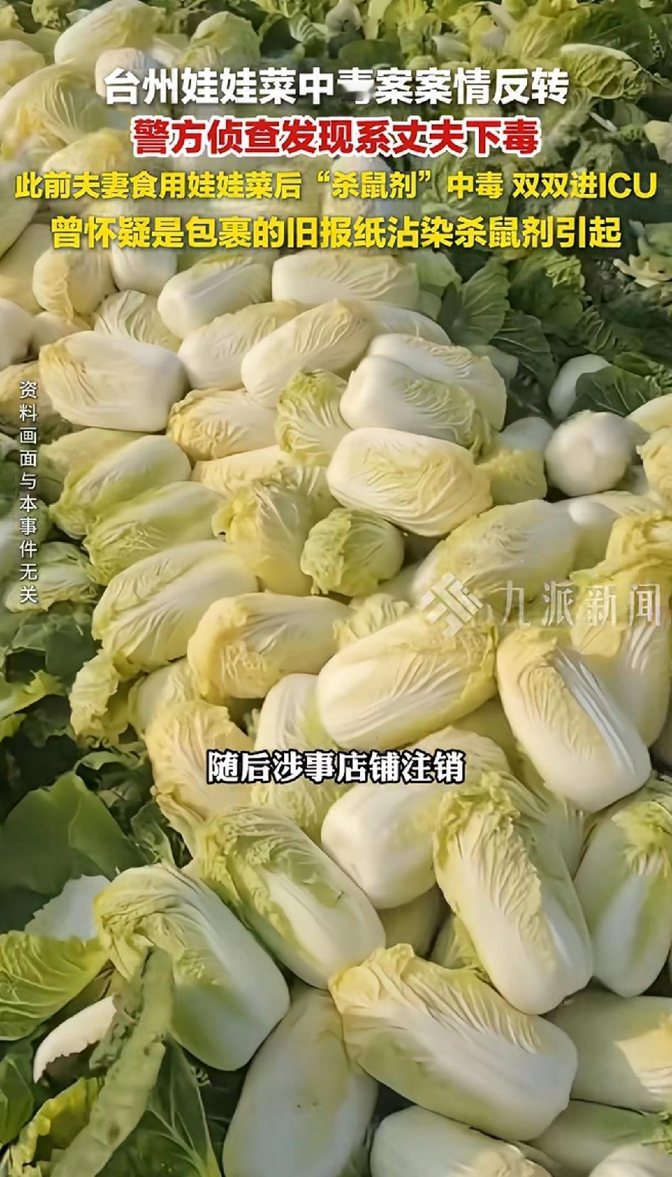 台州娃娃菜中毒案案情反转,警方侦查发现系丈夫下毒。此前怀疑是抱娃娃菜的报纸沾了毒药。夫妻使用后双双进ICU。 台州娃娃菜中毒案这剧情反转得比电视剧还刺激!一开始大家都以为就是普通的食物中毒,谁能想到背后藏着这么大的“雷”。 警方侦查一深入,好家伙,竟然是丈夫下毒。都说一日夫妻百日恩,这丈夫是心里揣着啥深仇大恨,能干出这种事。 夫妻做到这份上,也不知道多大的仇恨,“男版潘金莲”现世。古话是谋杀亲夫,现在是谋杀发妻。想离婚不想分给对方财产,只能谋害对方了。 活着太难了,防火防盗还要防枕边人。 这也给大家提了个醒,生活中看似亲密的人,说不定心里藏着不为人知的阴暗。以后看人可不能只看表面,知人知面不知心这话真是一点不假。不知道这背后到底有啥隐情,希望真相早日大白,给受害者一个公道。