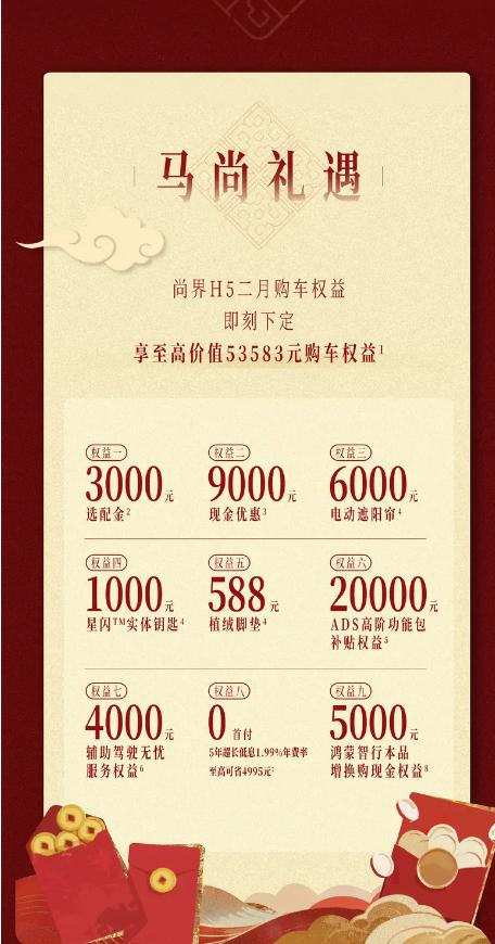 尚界H5二月购车权益上线,至高53583元福利一步到位,ADS高阶包补贴2万、现金优惠9千、选配金3千、电动遮阳帘6千...九项权益都给安排了,有春节前后打算购车的朋友吗,这力度你觉得怎么样?【来自懂车帝车友圈】
