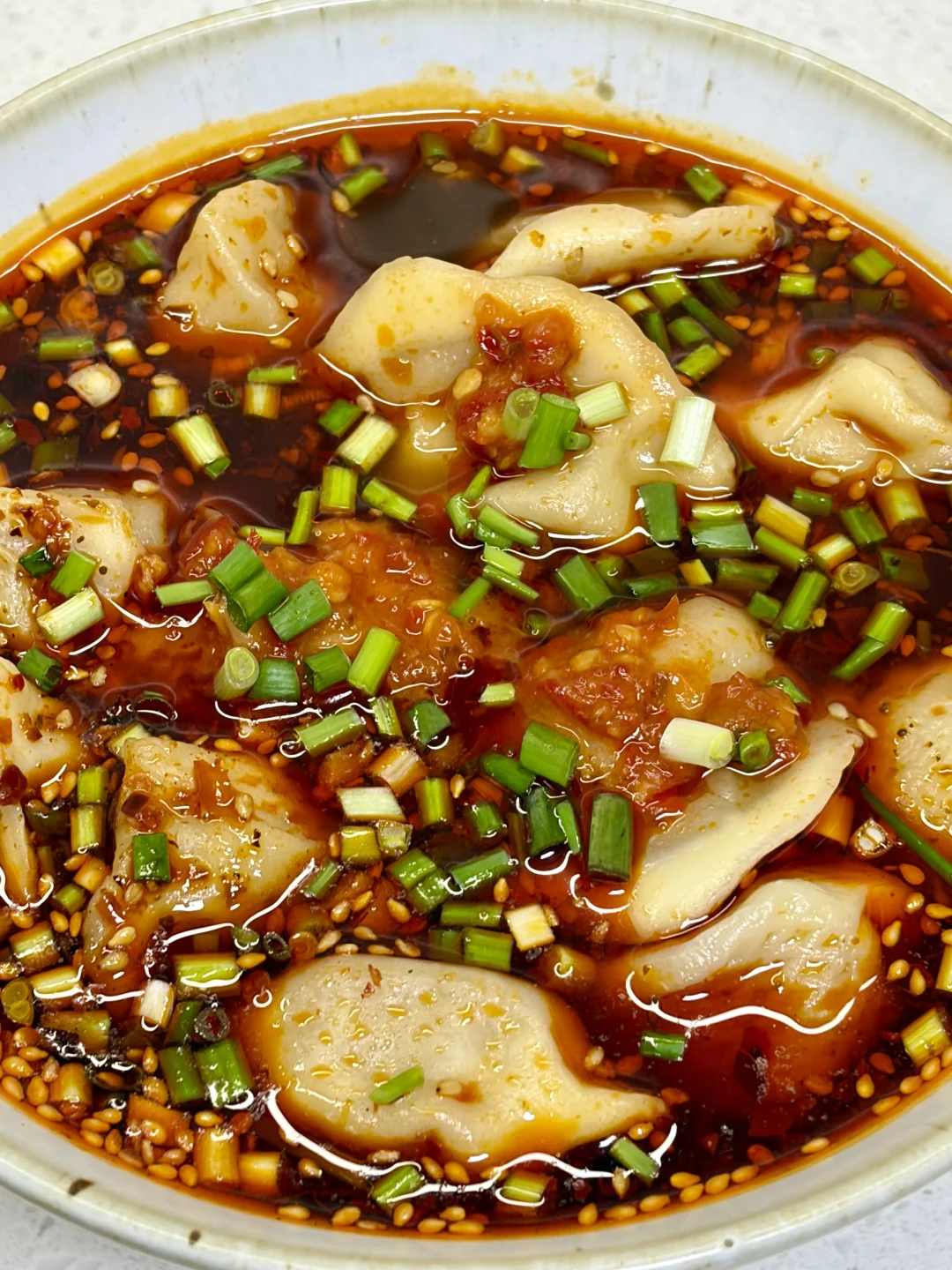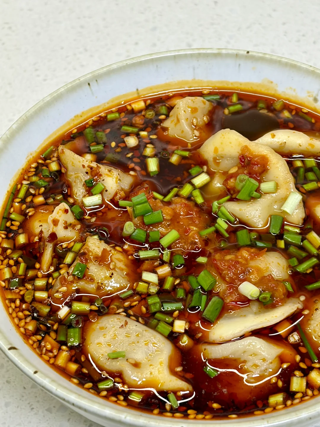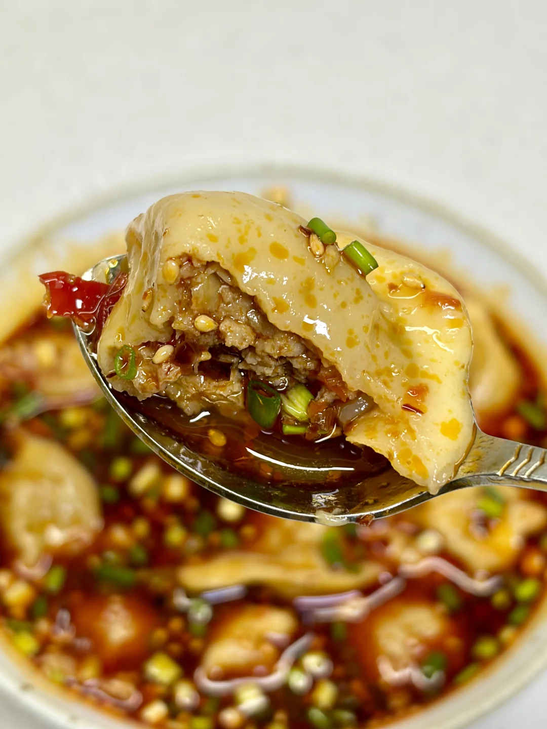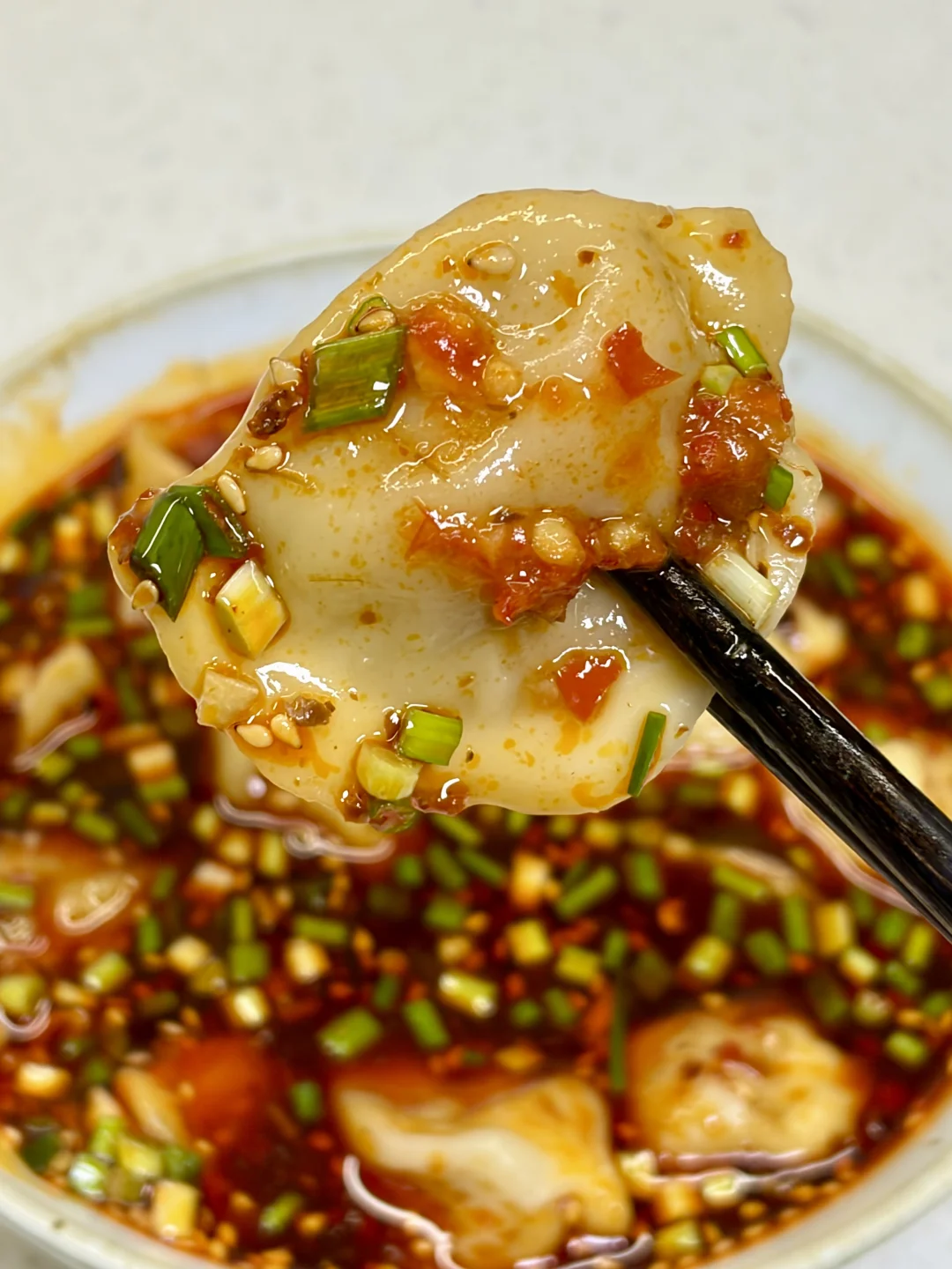 皮薄馅儿大的酸汤水饺,开胃又营养,做法简单,这个调料真的绝,今天我加了一点鲜椒牛肉酱,味道更上一个层次哦~ 1⃣️:梅花肉剁成肉馅,放入韭菜,鸡蛋 加入一勺盐 适量胡椒粉 生抽 一勺蚝油搅匀,用自己习惯的手法包成饺子形状 2⃣️:水开放入饺子煮熟,葱花蒜未白芝麻辣椒面淋热油,再加入一勺生抽两勺陈醋 少许猪油 一勺鲜椒牛肉酱 加入面汤搅匀加入适量面汤搅匀,捞出饺子拌匀即可