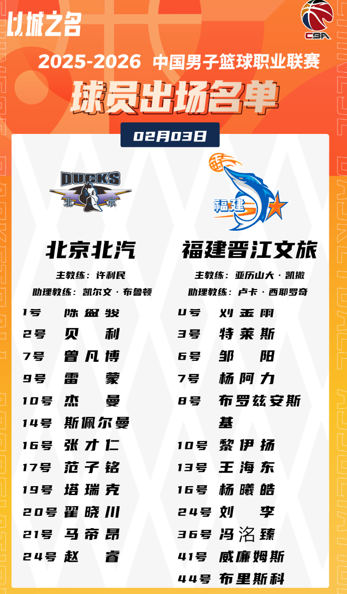 虎扑02月03日讯今晚CBA常规赛,北京对阵福建的大名单已经公布。