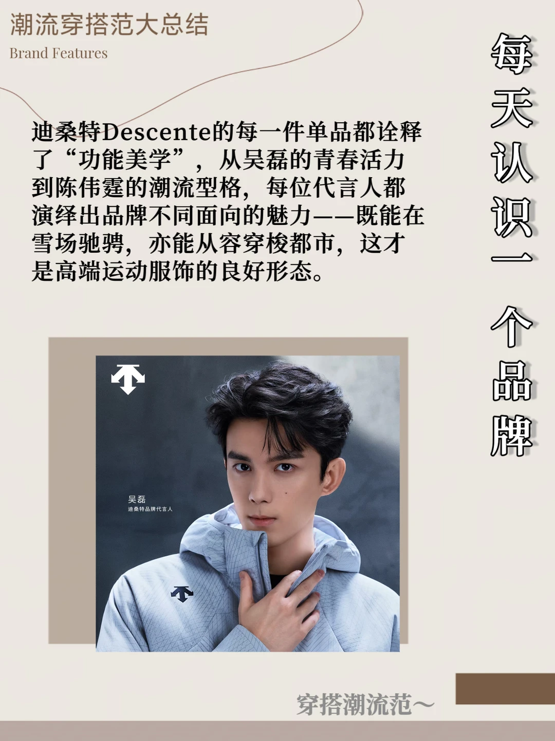 迪桑特Descente的每一件单品都诠释了“功能美学”,从吴磊的青春活力到陈伟霆的潮流型格,每位代言人都演绎出品牌不同面向的魅力——既能在雪场驰骋,亦能从容穿梭都市,这才是高端运动服饰的良好形态。