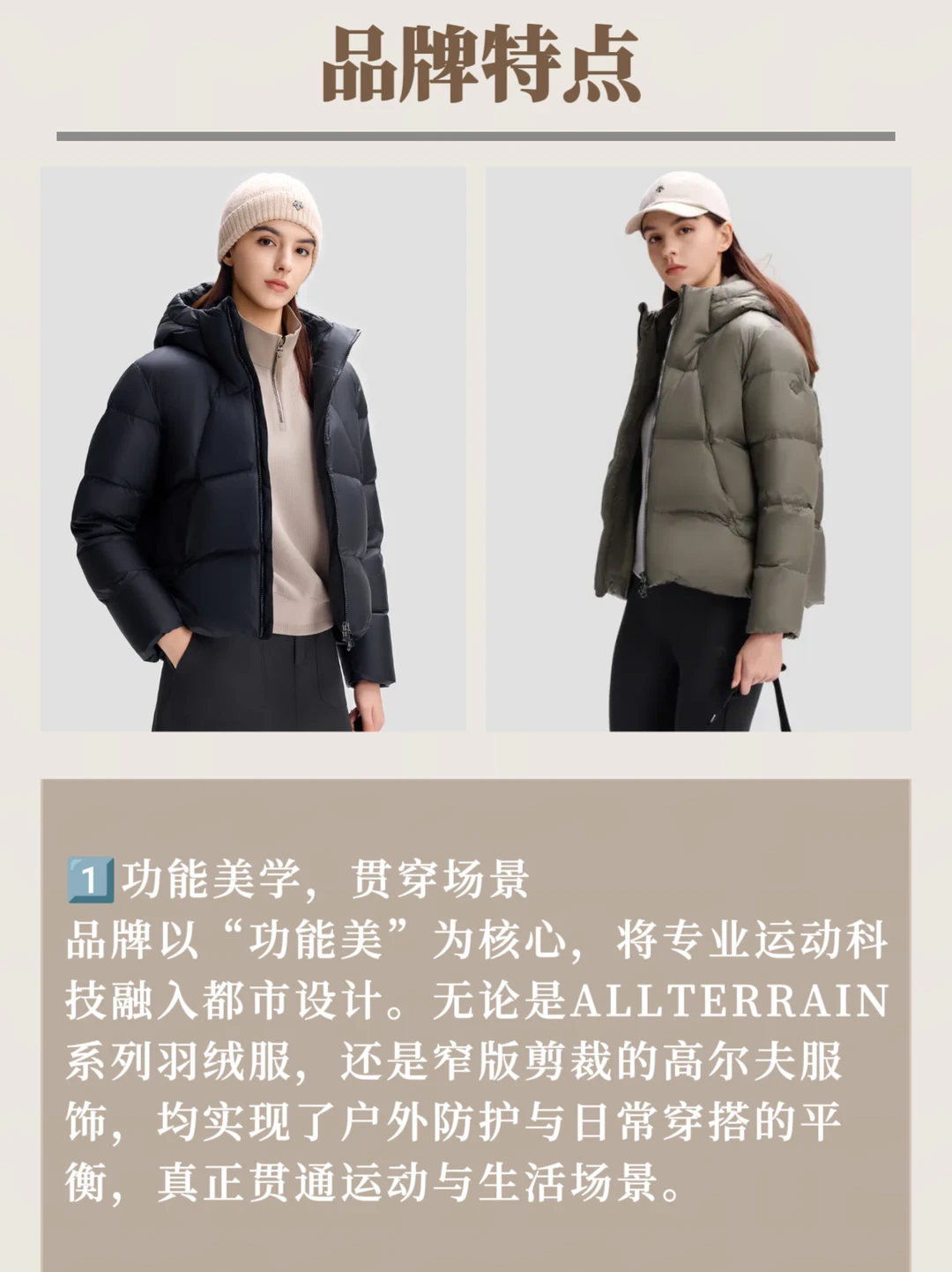 品牌以“功能美”为核心,将专业运动科技融入都市设计。无论是ALLTERRAIN系列羽绒服,还是窄版剪裁的高尔夫服饰,均实现了户外防护与日常穿搭的平衡,真正贯通运动与生活场景。