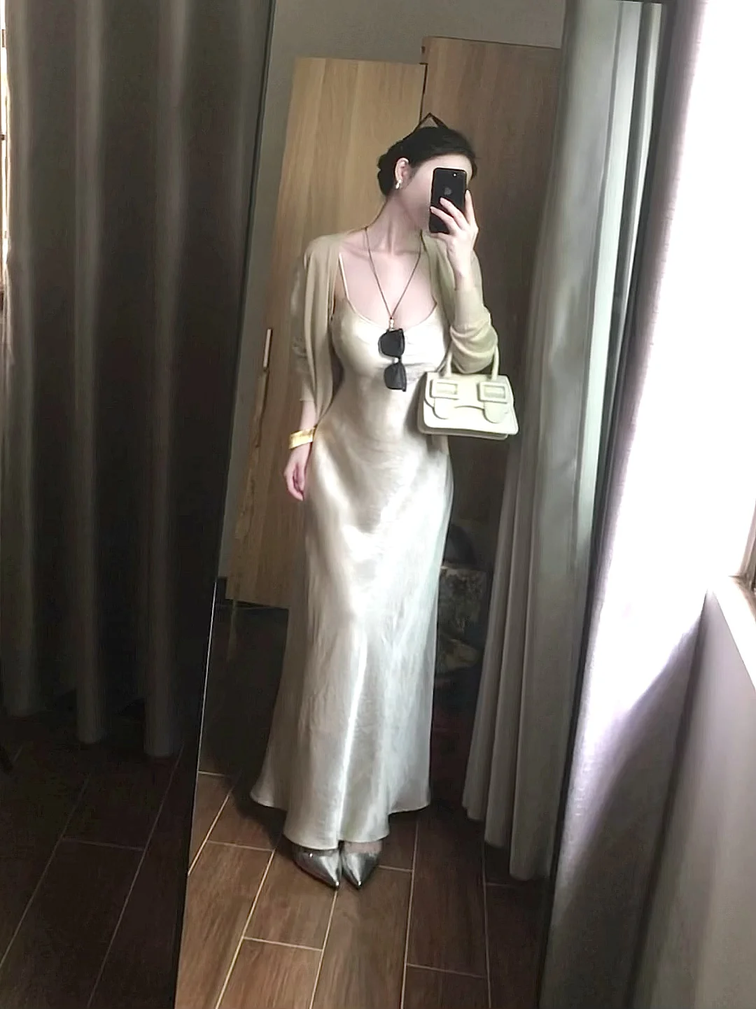 光之影&AI温柔气质穿搭,白色吊带裙搭配长袖衬衫,优雅动人。白衬衫裙穿搭白