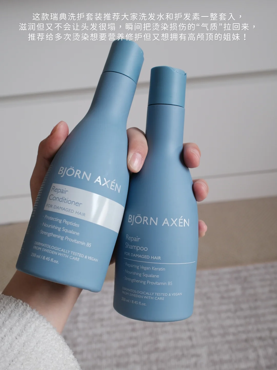 ⭕️总结,这款瑞典洗护套装推荐大家洗发水和护发素一整套入,虽然滋润但又不会让头顶很塌,瞬间把烫染损伤的“气质”拉回来,推荐给多次烫染想要营养修护但又想拥有高颅顶的姐妹!