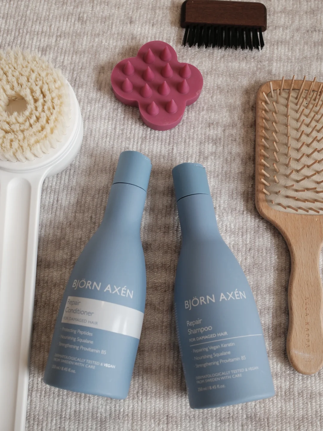 很久没写护发帖了,之前把卡诗全系列用了一遍很想换换口味,最近在用之前去丹麦旅行购入的瑞典皇室沙龙品牌Björn Axén,中文名:彼扬爱森,买的王牌蓝香槟修护套组。