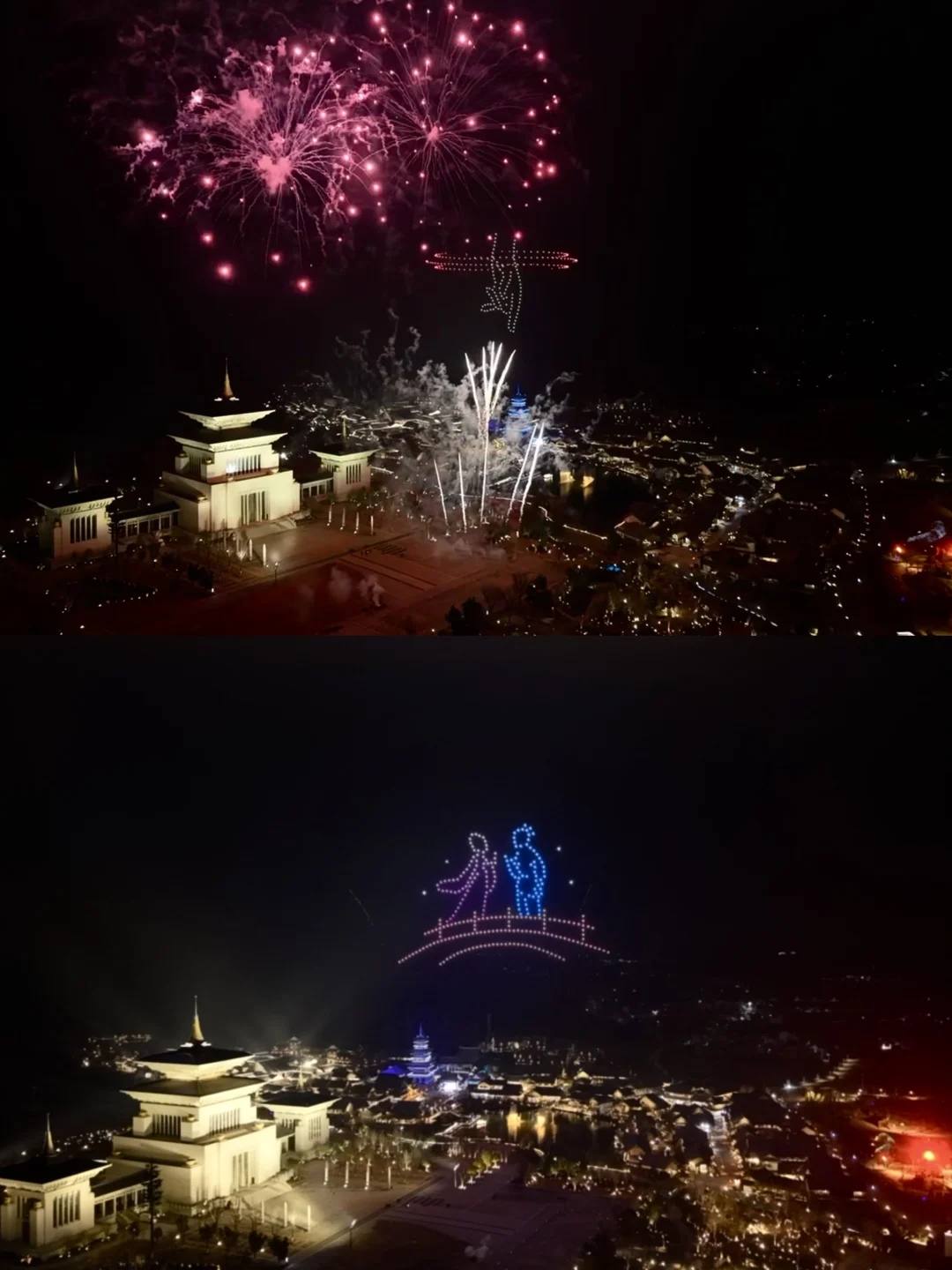 千架无人机绘制图案与孔明灯形成“天地同庆”视觉盛宴。