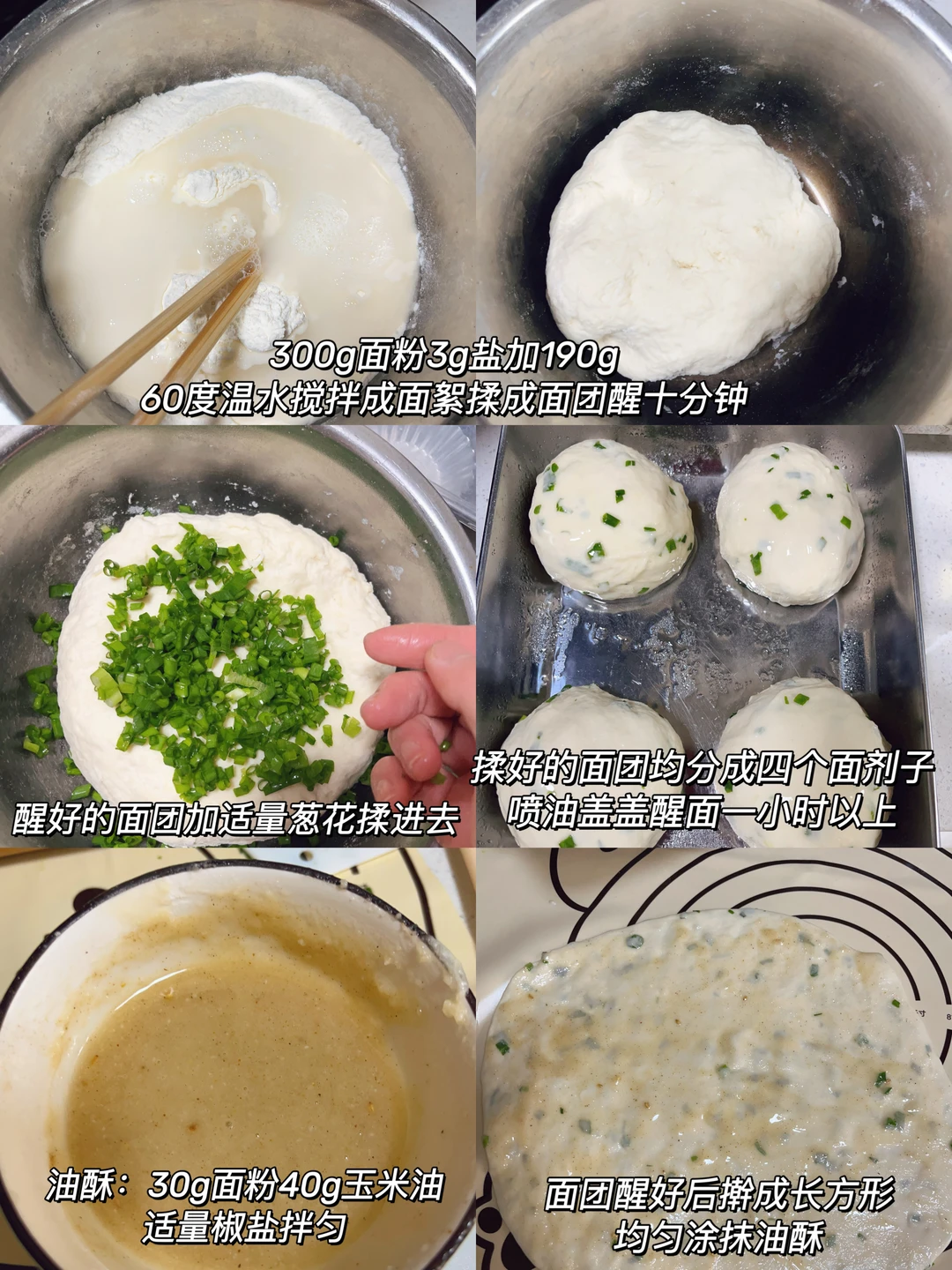 300g面粉、3g盐、190g60度温水、葱花