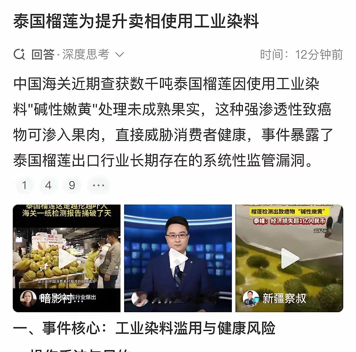 泰国人好的不学尽学坏的!他们真以为中国消费者是这么好忽悠的? 近日中国海关查获数千吨自泰国进口的榴莲。这些泰国榴莲因为还没有完全成熟,于是泰国出口商就向越南人学习,将未成熟的青色榴莲喷洒工业染料"碱性嫩黄",然后高价出口到中国。 这种染料主要用于塑料制品和皮革,对人体的危害很大。也不知道这些泰国出口商究竟是什么样的脑回路,他们竟然敢将如此剧毒的工业染料喷洒在榴莲上,然后将它们出口到中国,他们真的以为中国海关根本就检查不出来?这些人的智商真是让人感慨! 这件事情让我们明白,黑心商人哪个国家都有,他们为了谋取暴利,不惜铤而走险,再低端的手法他们也用得出来,完全不顾消费者的生命健康!对这些太贵,出口商必须全部拉黑,然后终身禁止他们向中国出口任何商品。