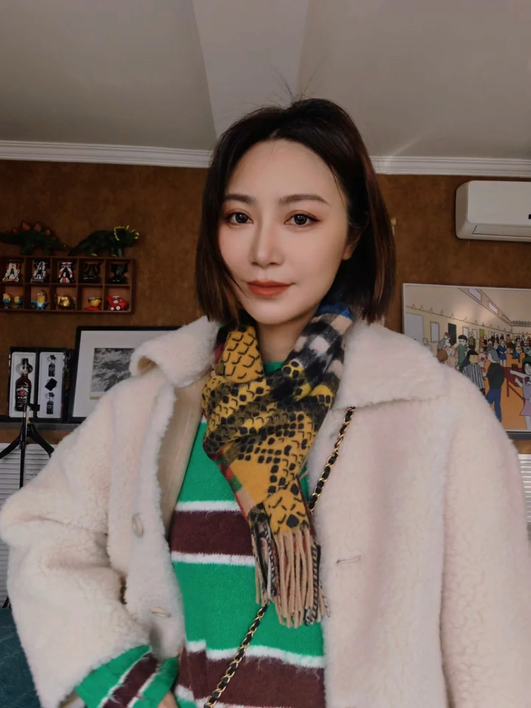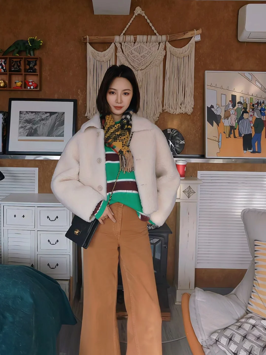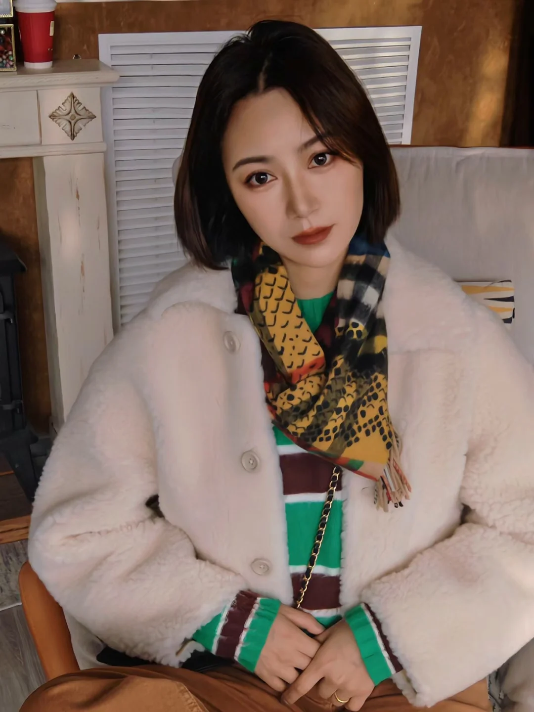 春节战袍敲定✅奶fufu的羊羔毛夹克款外套温柔到又利索,小小的翻领显得矜持又帅气。内搭绿红条纹衫超提气色,焦糖阔腿裤拉长比例一绝!围巾点睛,这套见家长/拜年都稳赢,显瘦又喜庆~