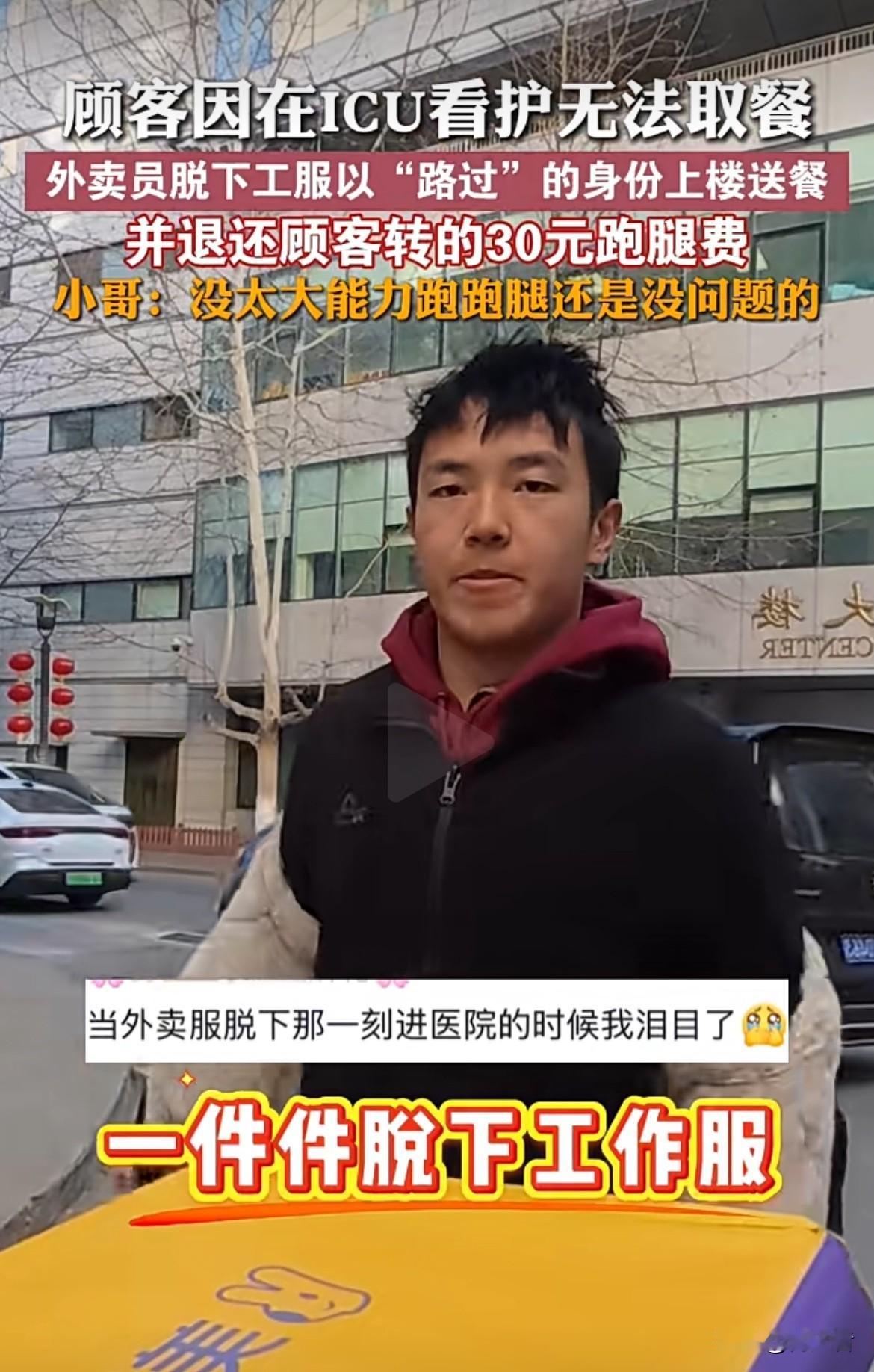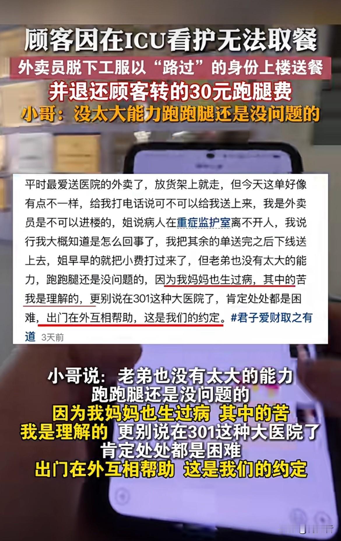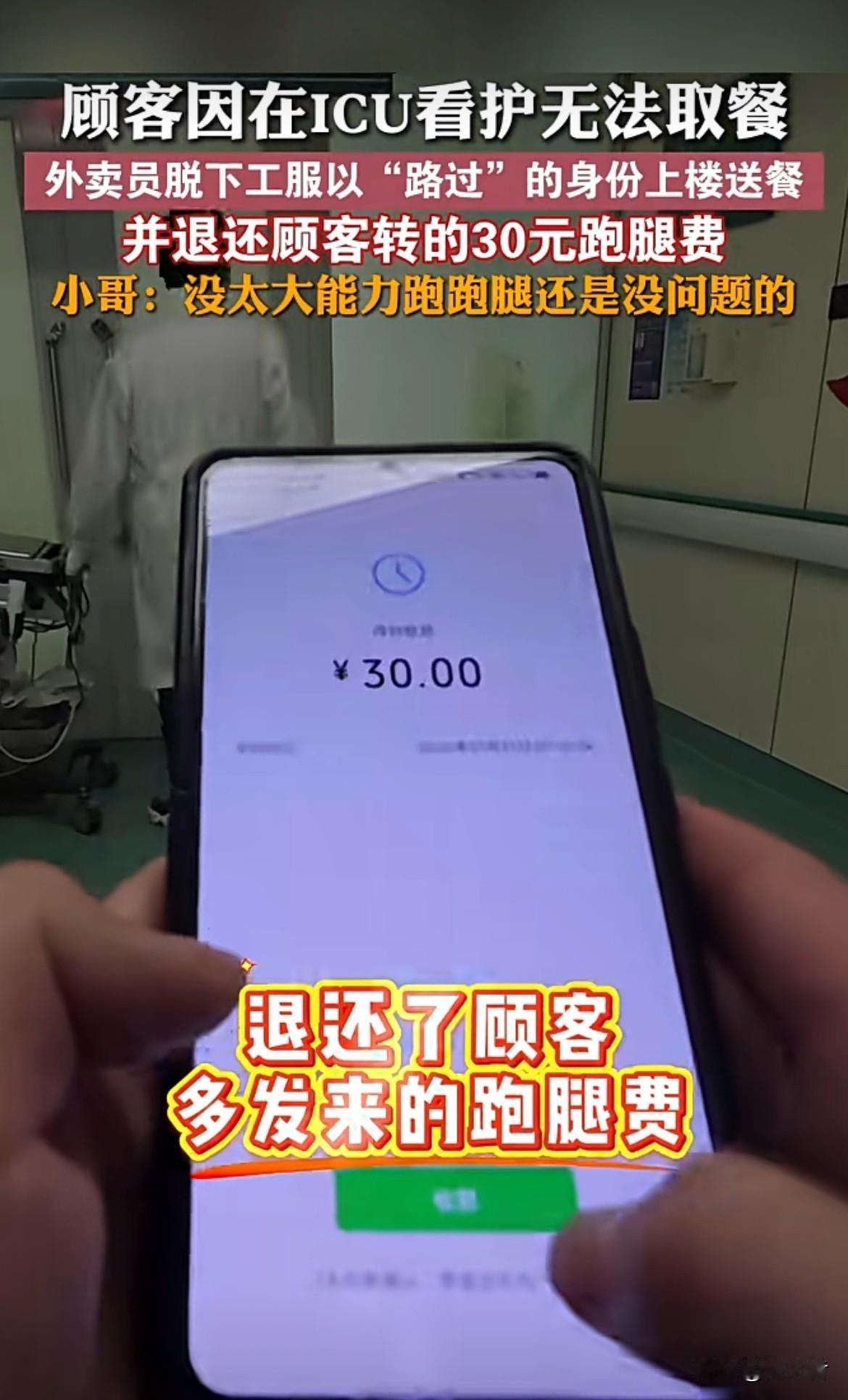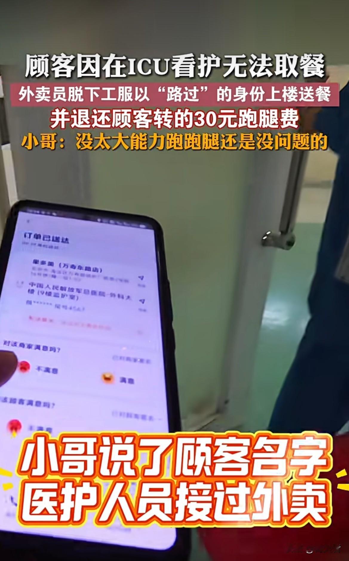这举动真的是满满的正能量!顾客在ICU看护没法取餐,小哥直接脱下工服,以“路过”身份送餐,还退还30元跑腿费,说自己没太大能力,跑跑腿没问题。希望社会能多一些像外卖小哥这样的正能量,平台也能多为从业者考虑考虑。